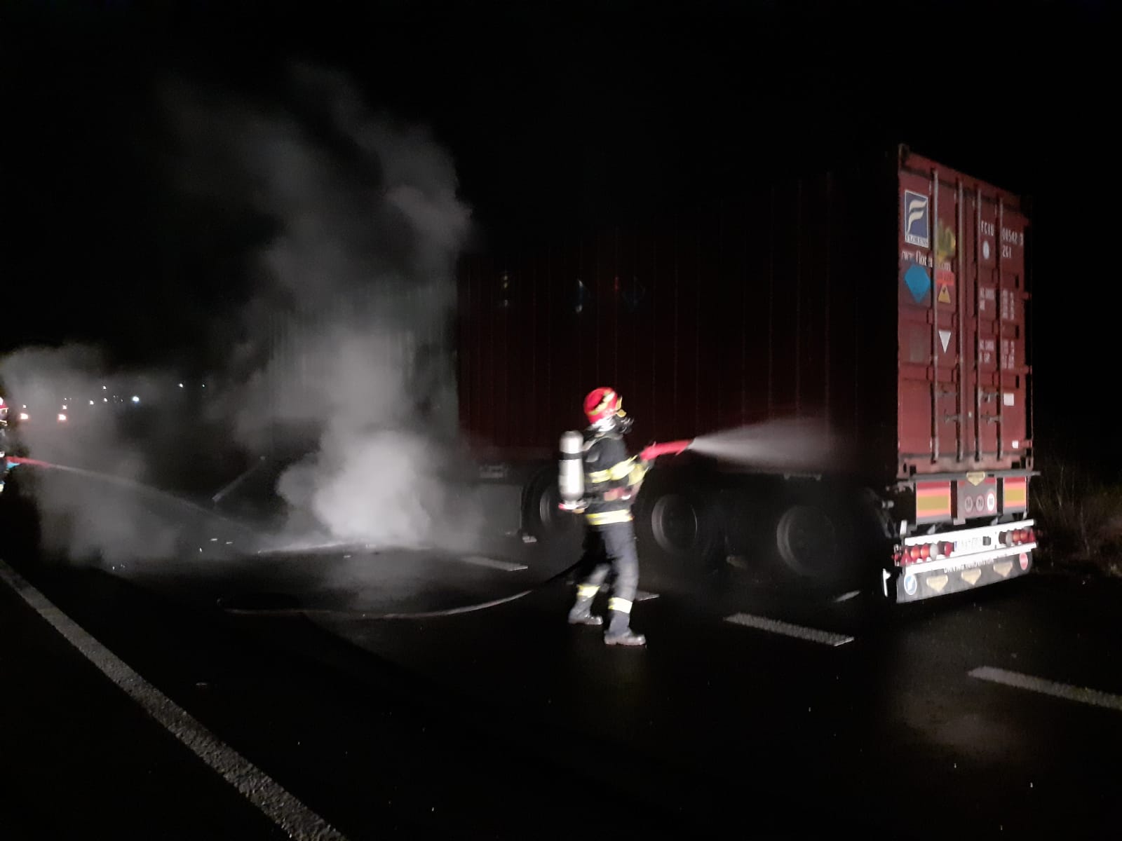 La scurt timp de la sosirea pompierilor la locul incendiului, flăcările au fost stinse, înainte ca acestea să se propage și la restul camionului.