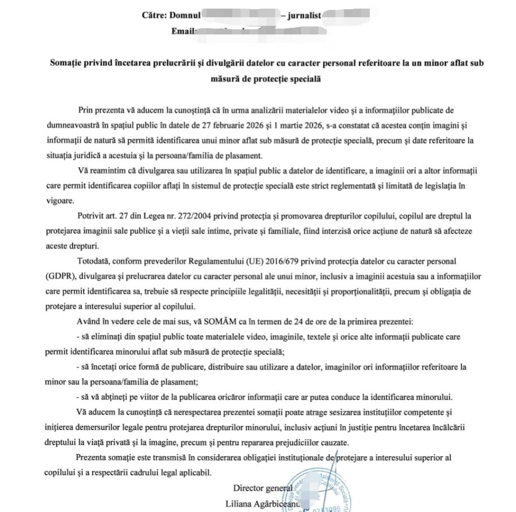 Notificarea disperată a Directorului DGASPC Liliana Agîrbiceanu prin purtătorul de cuvânt Beatrice Munteanu: