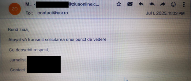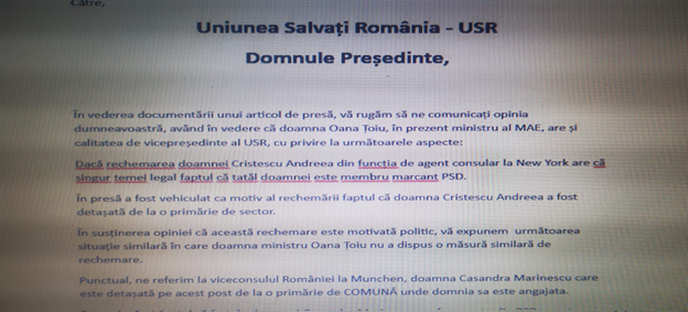 Având în vedere răspunsul prompt în mass-media a doamnei Oana Țoiu care este și vicepreședinte al USR, nu putem decât să salutăm promtitudinea răspunsului.