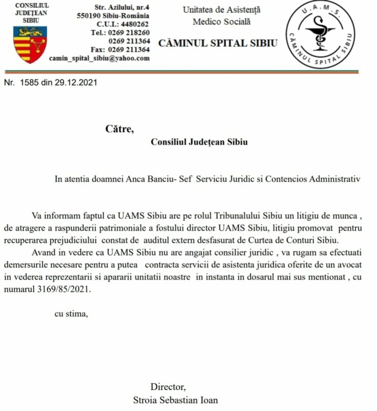 In urma investigatiilor jurnalistice efectuate de Ziua Online, unde anumite angajate îl acuzau pe dl. Vasile Sacelean, fostul director al azilului de pe str. Azilului din Municipiul Sibiu, a venit acum randul UAMS Sibiu sa isi faca dreptate cu fostul angajat in instanta.