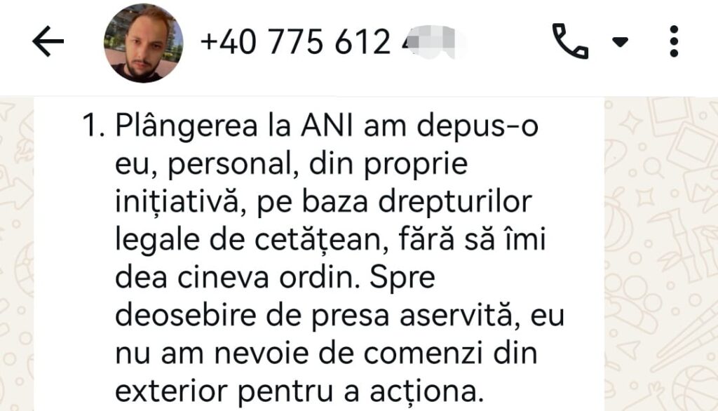 „Plângerea la ANI am depus-o eu, personal, din proprie inițiativă, pe baza drepturilor legale de cetățean, fără să îmi dea cineva ordin. Spre deosebire de presa aservită, eu nu am nevoie de comenzi din exterior pentru a acționa.”