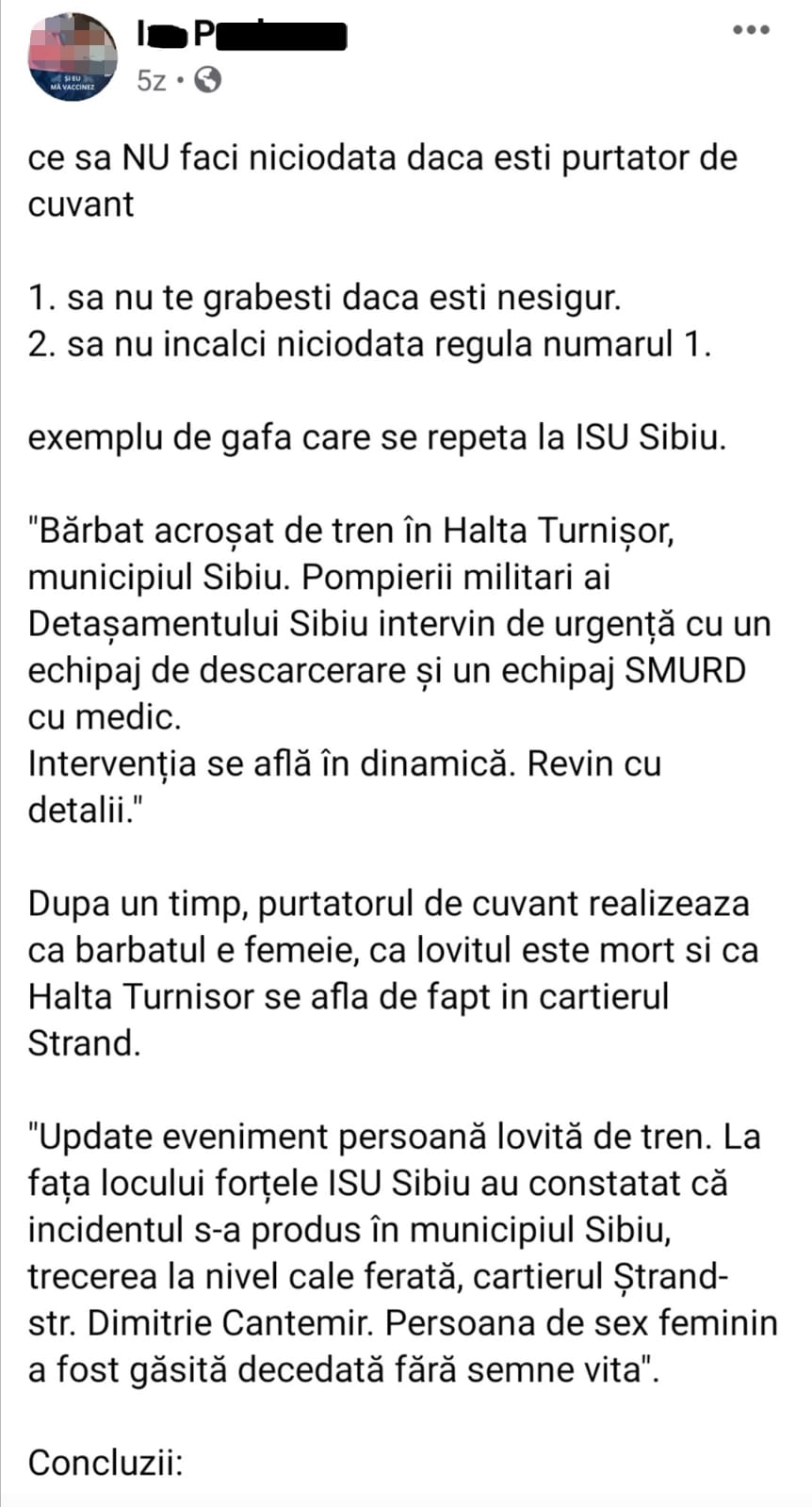 La data de 09.02.2021, I.P. isi arata supărarea pe purtatorul de cuvant al ISU Sibiu,deoarece in prima faza, spunea despre femeia călcată de tren că e bărbat.