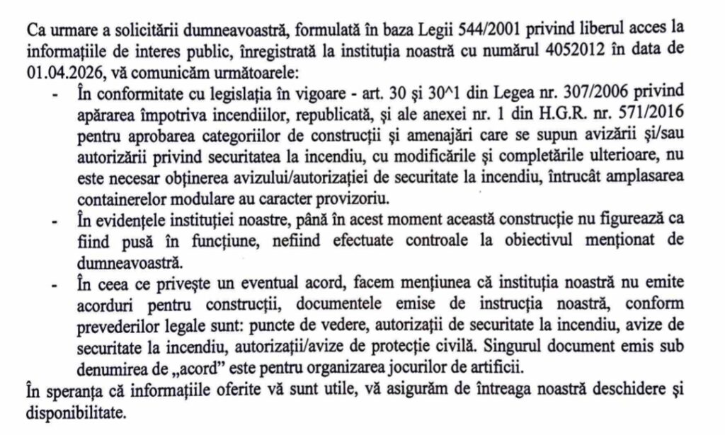 Un răspuns transmis de Inspectoratul pentru Situații de Urgență Sibiu, în baza unei solicitări privind accesul la informații publice, aruncă o lumină îngrijorătoare asupra situației. Instituția precizează clar că nu este necesară autorizația de securitate la incendiu deoarece construcția are „caracter provizoriu”. Cu alte cuvinte, tocmai statutul temporar al acestor containere le scoate de sub obligația unor avize esențiale pentru siguranță.
