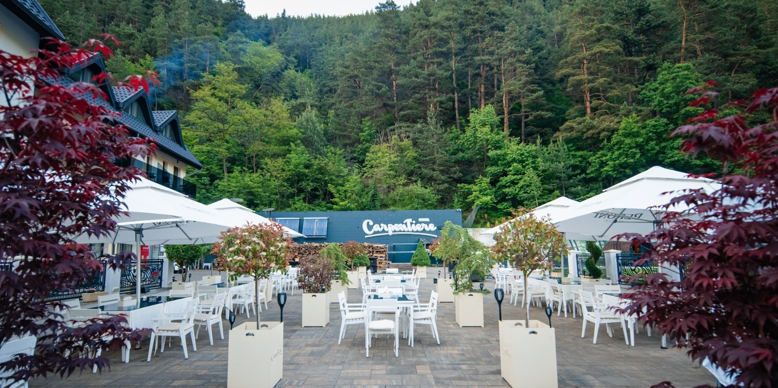 La Carpentiere Arena, mancarea buna este doar jumatate din experienta. Cealalta jumatate o face cadrul natural. Restaurantul nostru beneficiaza de o terasa generoasa, situata la aproape 1000 de metri altitudine, cu vedere spectaculoasa la padurile de conifere si crestele muntilor Cindrel. Este genul de priveliste care transforma o masa buna intr-o amintire de neuitat.