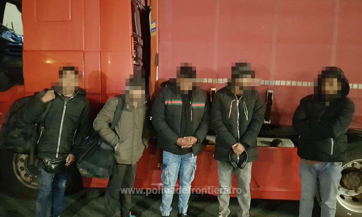 În urma efectuării controlului amănunţit al mijlocului de transport, au fost descoperiţi, ascunşi în cabina șoferului, respectiv în lada laterală de depozitare a semiremorcii, 5 cetățeni străini.