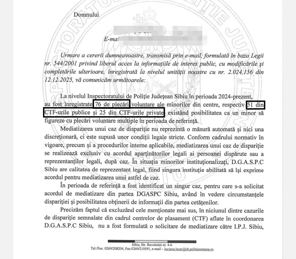 De la începutul anului 2024 și până în prezent, 76 de copii au plecat din centre rezidențiale din Sibiu, 51 din centre de stat și 25 din centre private.