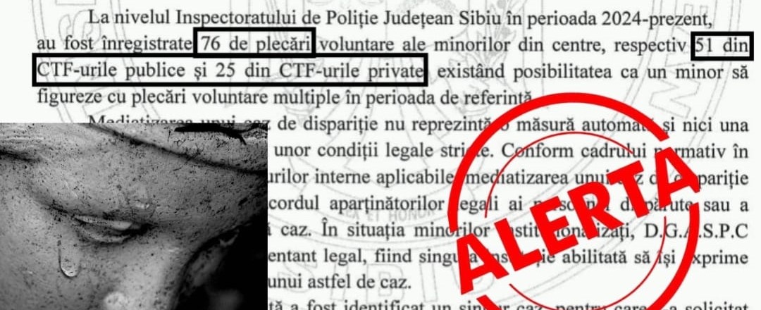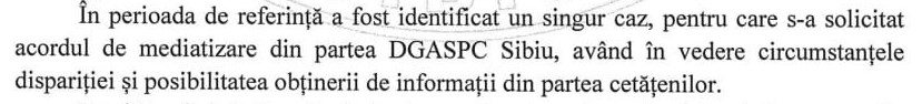 Unul dintre cazuri este al unei fete minore aflate în sistemul de protecție, care a plecat din de Pediatrie Sibiu și este dispărută de peste o săptămână. Nici acest caz nu a fost mediatizat!
