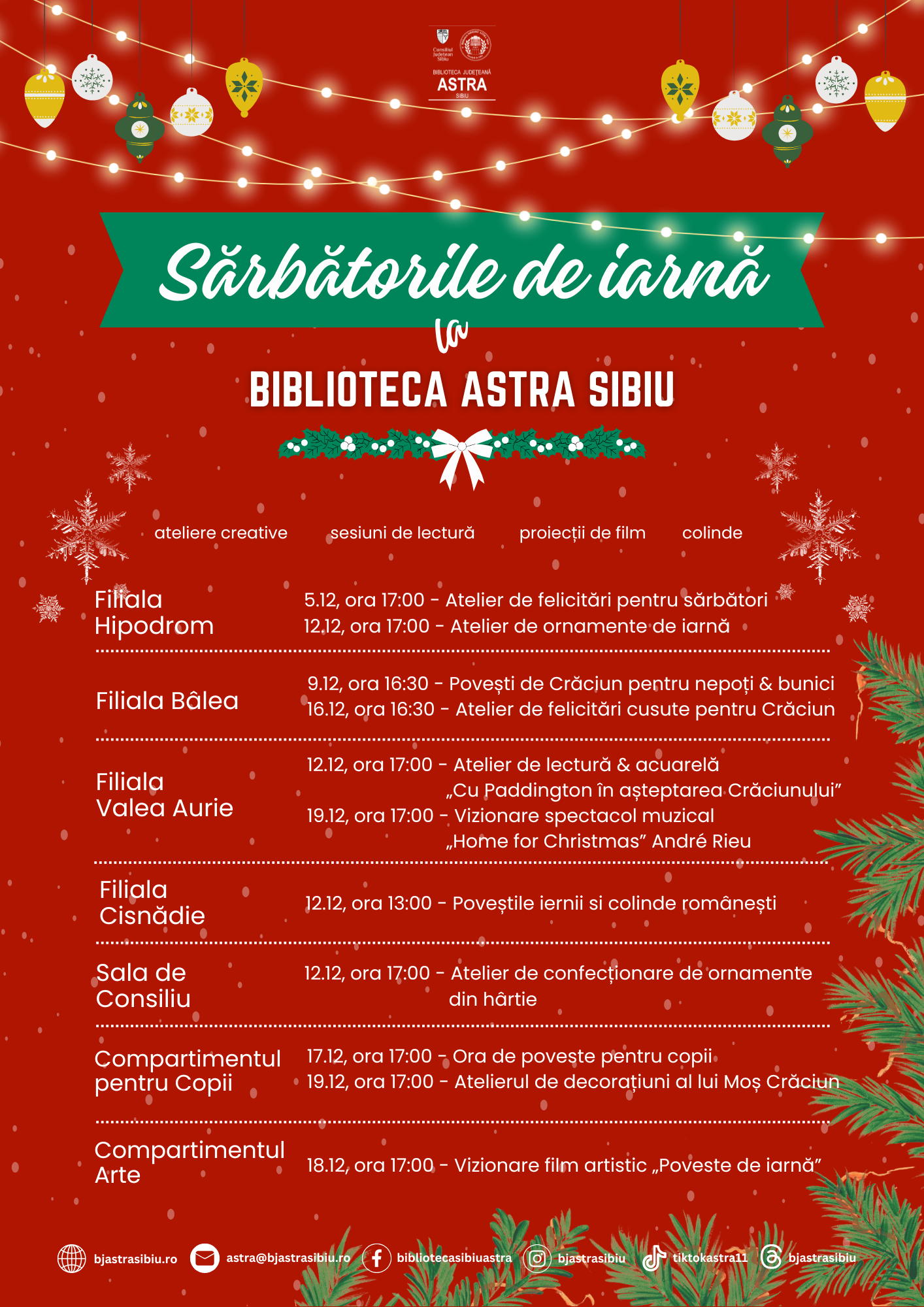 În luna decembrie, Biblioteca ASTRA Sibiu – instituție de cultură care beneficiază de susținere financiară din partea Consiliului Județean Sibiu – adresează publicului invitația de a participa la activități specifice anotimpului alb. Sibienii sunt invitați să trăiască spiritul sărbătorilor de iarnă printr-o serie de activități interactive: ateliere creative de decorațiuni, proiecții de film și sesiuni de lectură tematică, completate cu acorduri de colinde și arome de ceai cald.