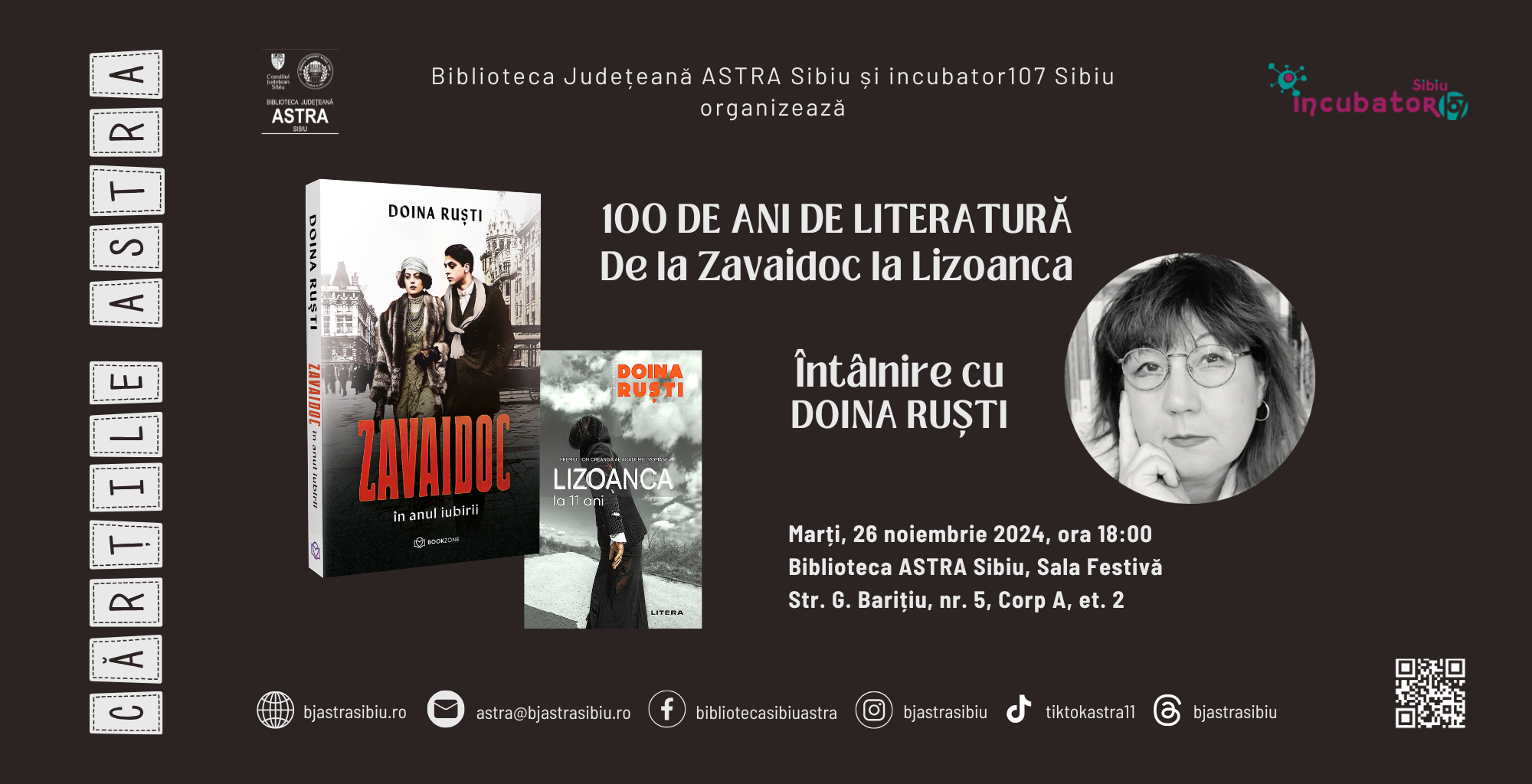 Biblioteca Județeană ASTRA, în parteneriat cu Clubul de carte incubator107 Sibiu, anunță organizarea unui eveniment de excepție, „100 de ani de literatură – De la Zavaidoc la Lizoanca”, cu participarea specială a scriitoarei Doina Ruști. Organizată în cadrul programului „Cărțile ASTRA”, întâlnirea va avea loc în data de 26 noiembrie 2024, la ora 18:00, la Sala Festivă a bibliotecii publice sibiene, instituție care se beneficiază de susținere financiară din partea Consiliului Județean Sibiu. Alături de binecunoscuta scriitoare se vor afla: Andra Tischer, autor și profesor de limba și literatura română, conf. univ. dr. Diana Nechit, conf. univ. dr. Andrei Șerban și psiholog Codruța Răbăgel.
