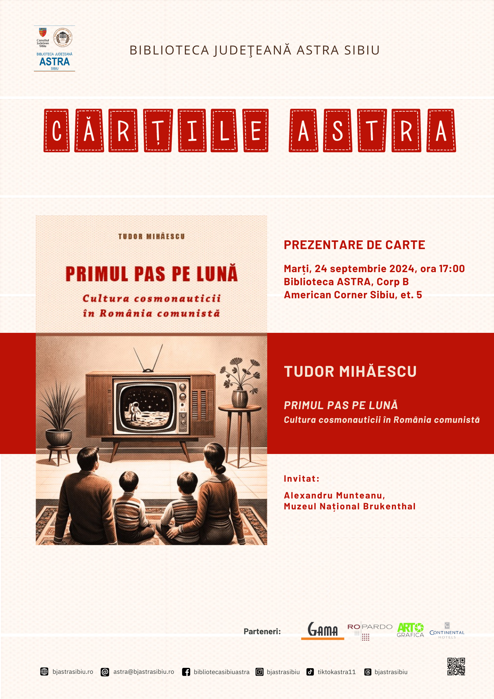 În cadrul programului cultural „Cărțile ASTRA”, Biblioteca Județeană ASTRA Sibiu anunță prezentarea volumului „PRIMUL PAS PE LUNĂ. Cultura cosmonauticii în România comunistă”, semnat de Tudor Mihăescu, muzeograf la Observatorul Astronomic „Amiral Vasile Urseanu” din București. Evenimentul va avea loc marți, 24 septembrie 2024, începând cu ora 17:00, în spațiul American Corner Sibiu, situat la etajul 5 al bibliotecii publice, care se bucură de sprijin financiar acordat de Consiliul Județean Sibiu. Alături de autor se va afla Alexandru Munteanu, muzeograf în cadrul Muzeului Național Brukenthal.