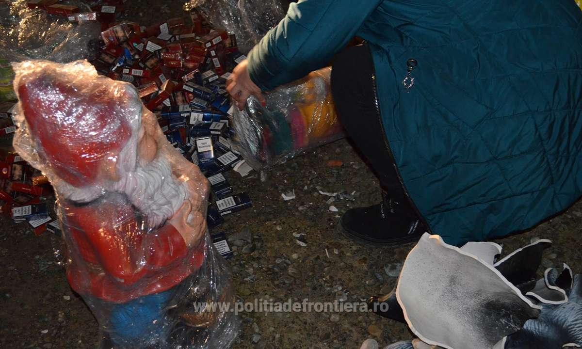 Polițiștii de frontieră din cadrul Serviciului Teritorial al Poliției de Frontieră Botoșani au descoperit în urma unei acțiuni specifice, ascunse în mai multe ornamente din ceramică pentru grădină, peste 4.100 de pachete cu ţigări, în valoare totală de peste 40.700 de lei. Două autoutilitare utilizate în activitatea infracţională au fost indisponibilizate, iar în cauză sunt efectuate cercetări sub aspectul săvârşirii infracţiunii de contrabandă.