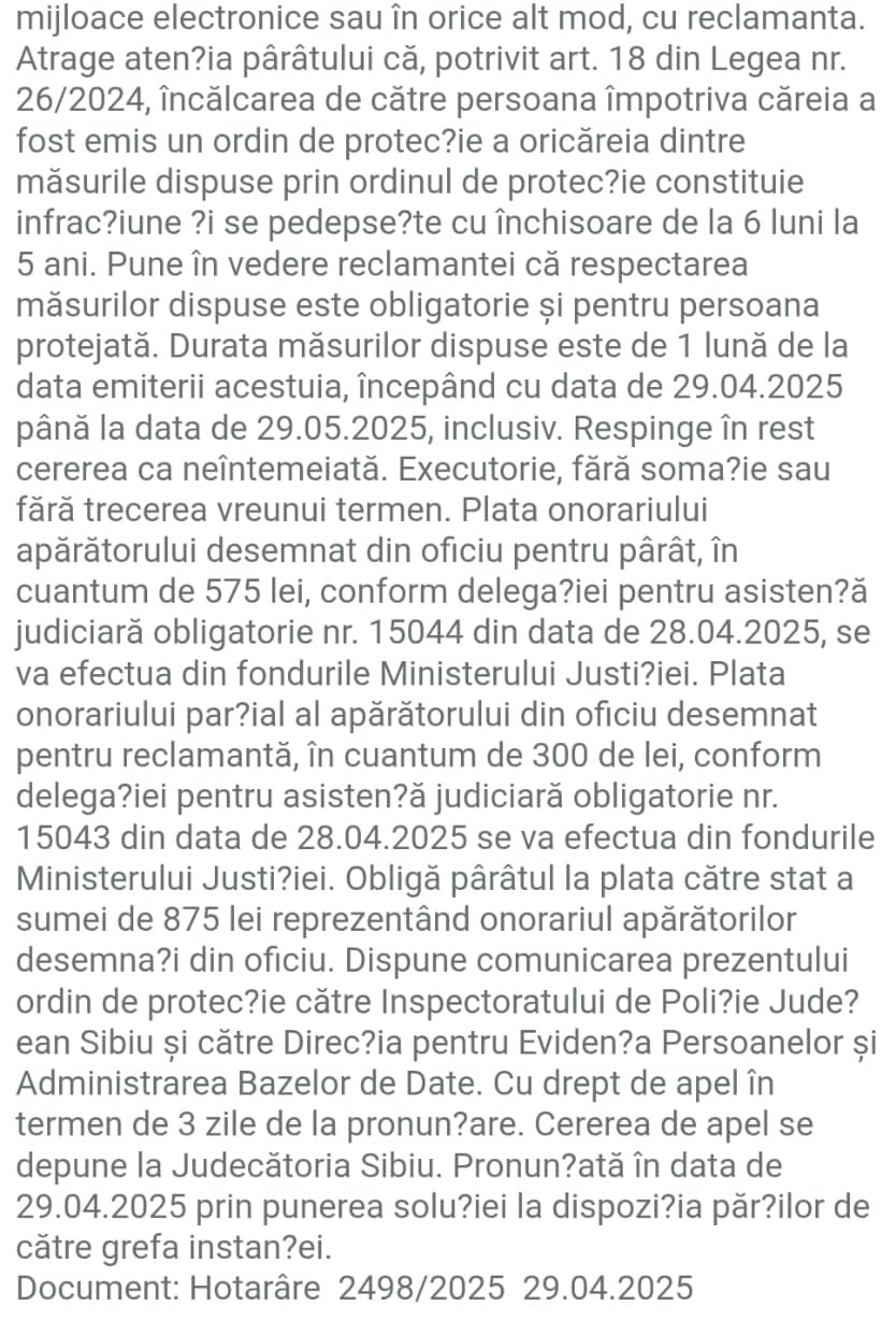 Hotărârea este executorie de la data pronunțării și a fost comunicată Inspectoratului de Poliție Județean Sibiu și Direcției pentru Evidența Persoanelor și Administrarea Bazelor de Date. Părțile au drept de apel în termen de 3 zile de la pronunțare, cererea de apel urmând a fi depusă la Judecătoria Sibiu.