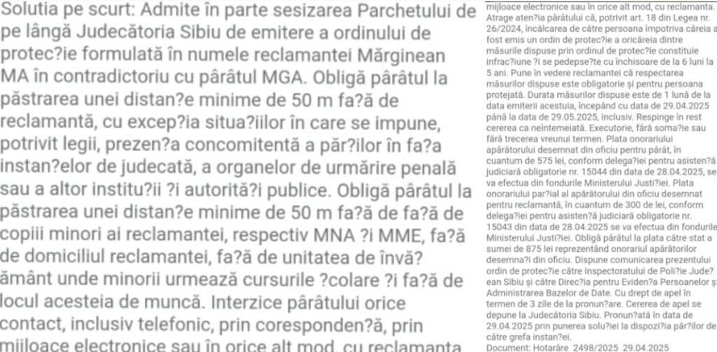 Judecătoria Sibiu a admis parțial cererea Parchetului de pe lângă Judecătoria Sibiu privind emiterea unui ordin de protecție împotriva unui notar public din Sibiu, identificat cu inițialele M.G.A.. Dosarul a fost soluționat în regim de urgență de completul C10 MF Urgențe.