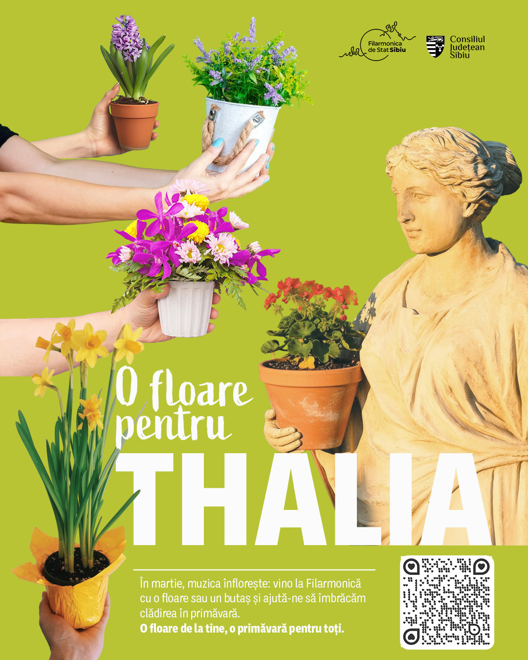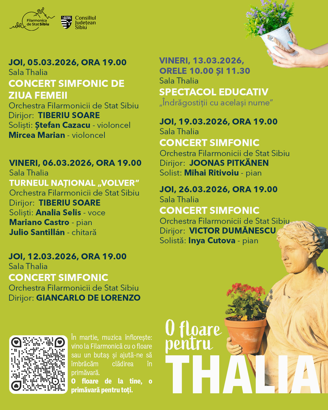 La Filarmonica de Stat Sibiu, martie este o lună a întâlnirilor muzicale și a proiectelor dedicate comunității. Programul reunește concerte simfonice, un concert vocal-simfonic, un spectacol pentru copii și un atelier educativ. Sub semnul campaniei „O Floare pentru Thalia”, instituția invită publicul să transforme fiecare seară de concert într-un gest simbolic de primăvară. Prin această inițiativă, spectatorii sunt încurajați să vină la concerte cu o floare în ghiveci sau un butaș, contribuind astfel la înfrumusețarea spațiului exterior al Filarmonicii.