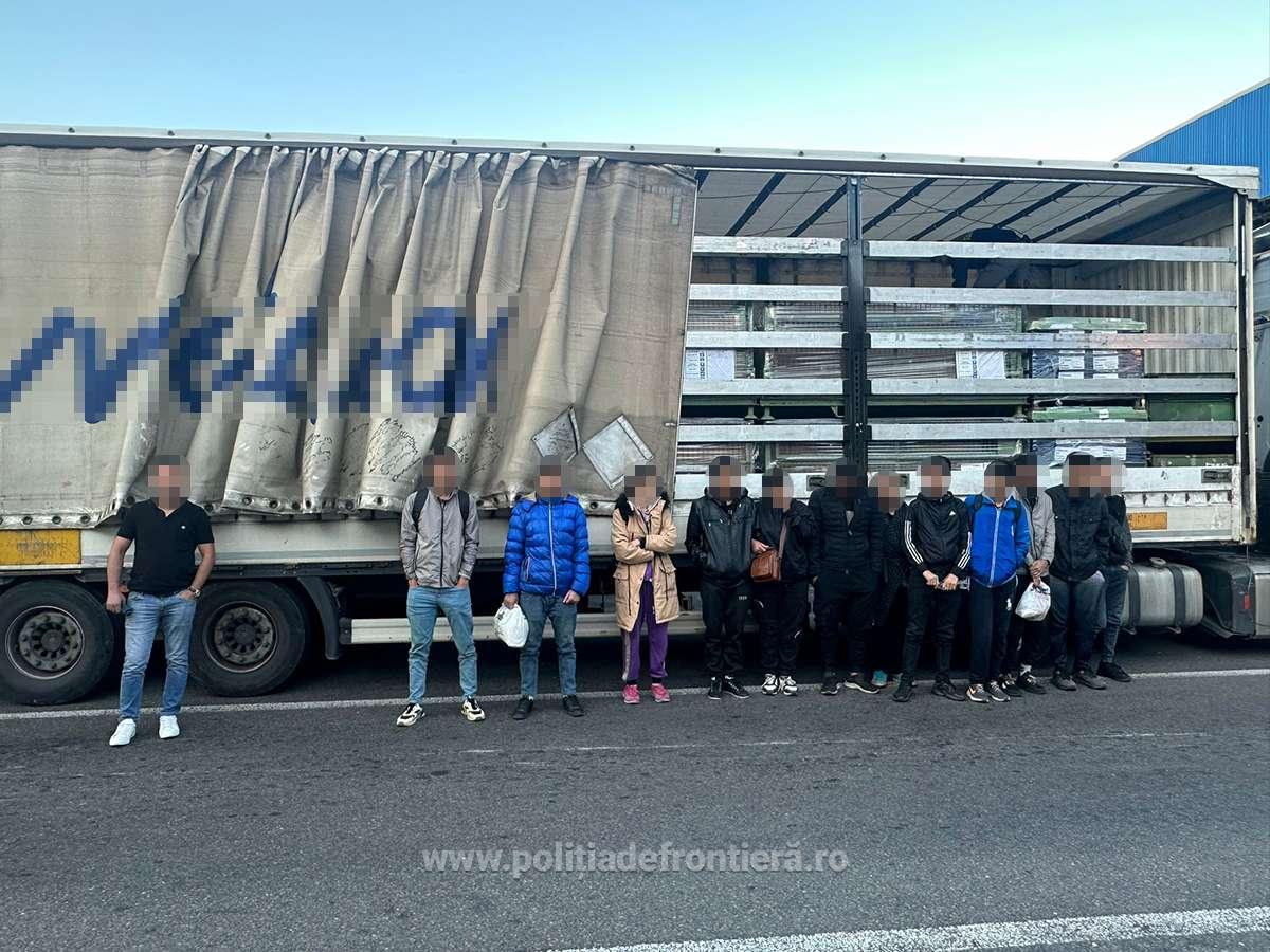 În urma efectuării controlului amănunţit asupra mijlocului de transport, au fost descoperiţi, ascunşi în compartimentul pentru marfă, 13 cetăţeni străini.