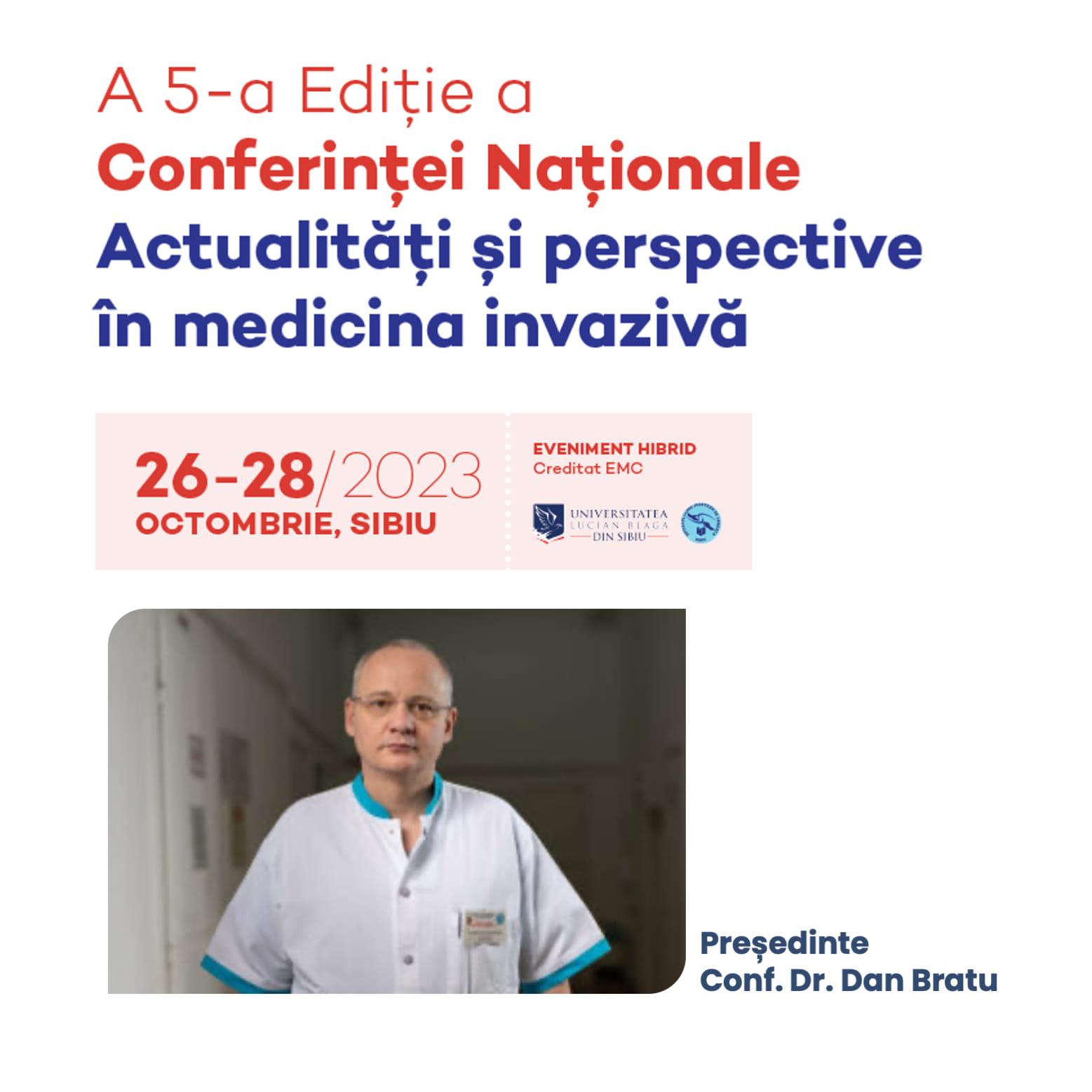Joi 26 octombrie, la Sibiu, va debuta cea de-a V – a ediție a conferinței naționale, cu participare internațională, “Actualități și perspective în medicina invazivă”, manifestare științifică susținută de Facultatea de Medicină din cadrul Universității “Lucian Blaga” din Sibiu și de Spitalul Clinic Județean de Urgență Sibiu. Evenimentul se va desfășura, pe parcursul a 3 zile, în format hibrid: fizic la sediul Facultății de Medicină, Strada Lucian Blaga 2A, cât și online.