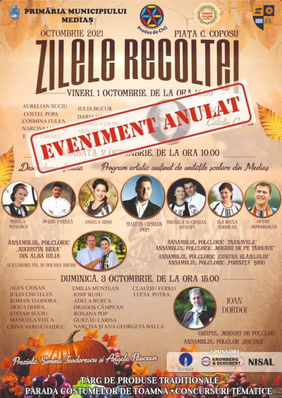 Având în vedere situația epidemiologică înregistrată la nivelul municipiului Mediaș, transpusă prin creșterea ratei de incidență a îmbolnăvirilor în ceea ce privește virusul SARS COV 2, Primăria Municipiului Mediaș a hotărât anularea evenimentului „Zilele Recoltei“. Măsura este necesară pentru prevenirea și combaterea efectelor pandemiei COVID-19 la nivelul populației din municipiul nostru.