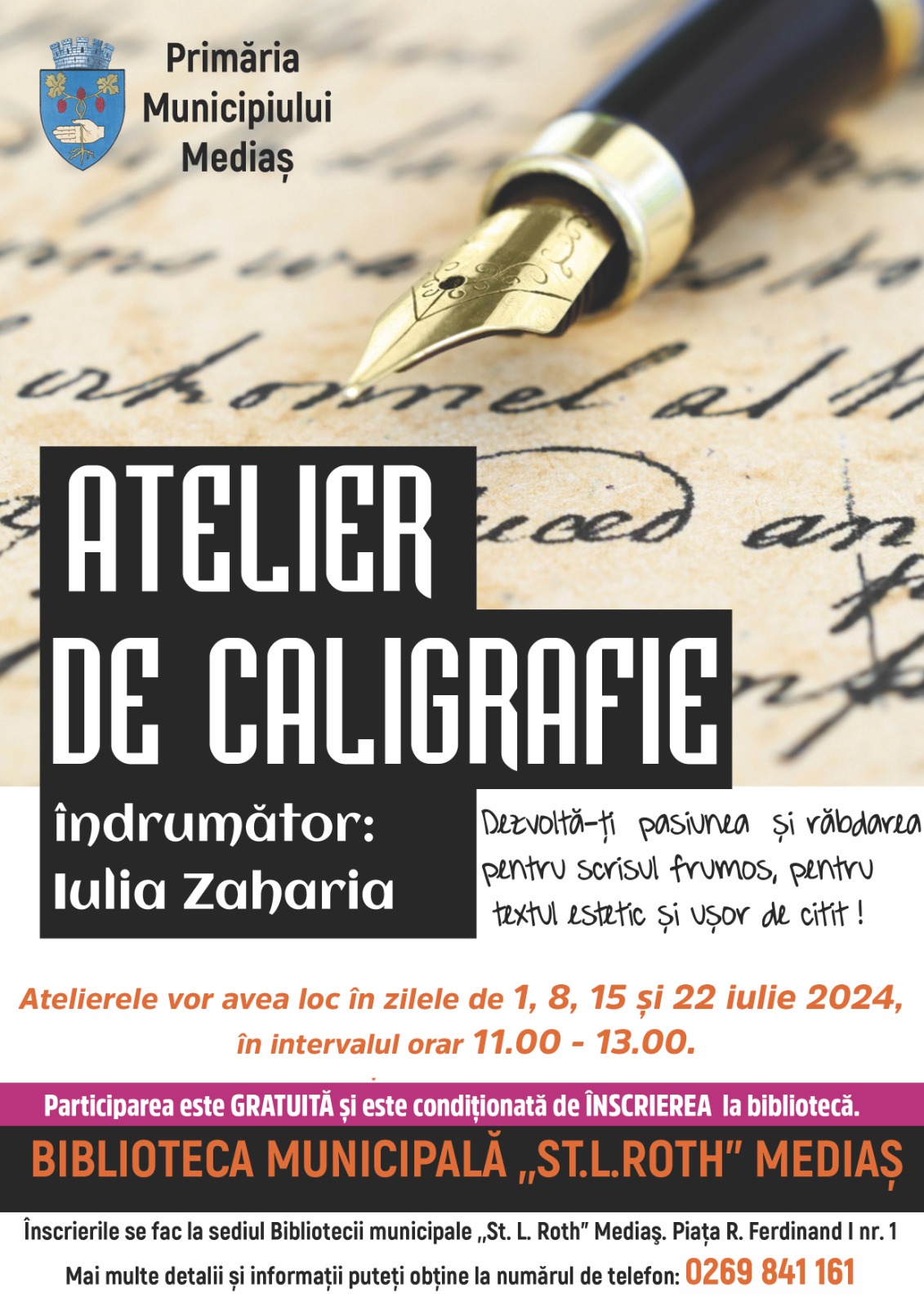 Primăria Municipiului Mediaș, prin Direcția pentru Cultură, organizează în luna iulie o nouă ediție a atelierului de caligrafie. Cursul se va desfășura la sediul Bibliotecii Municipale „St. L. Roth“, începând cu data de 1 iulie 2024, sub îndrumarea doamnei Iulia Zaharia, profesor de desen.