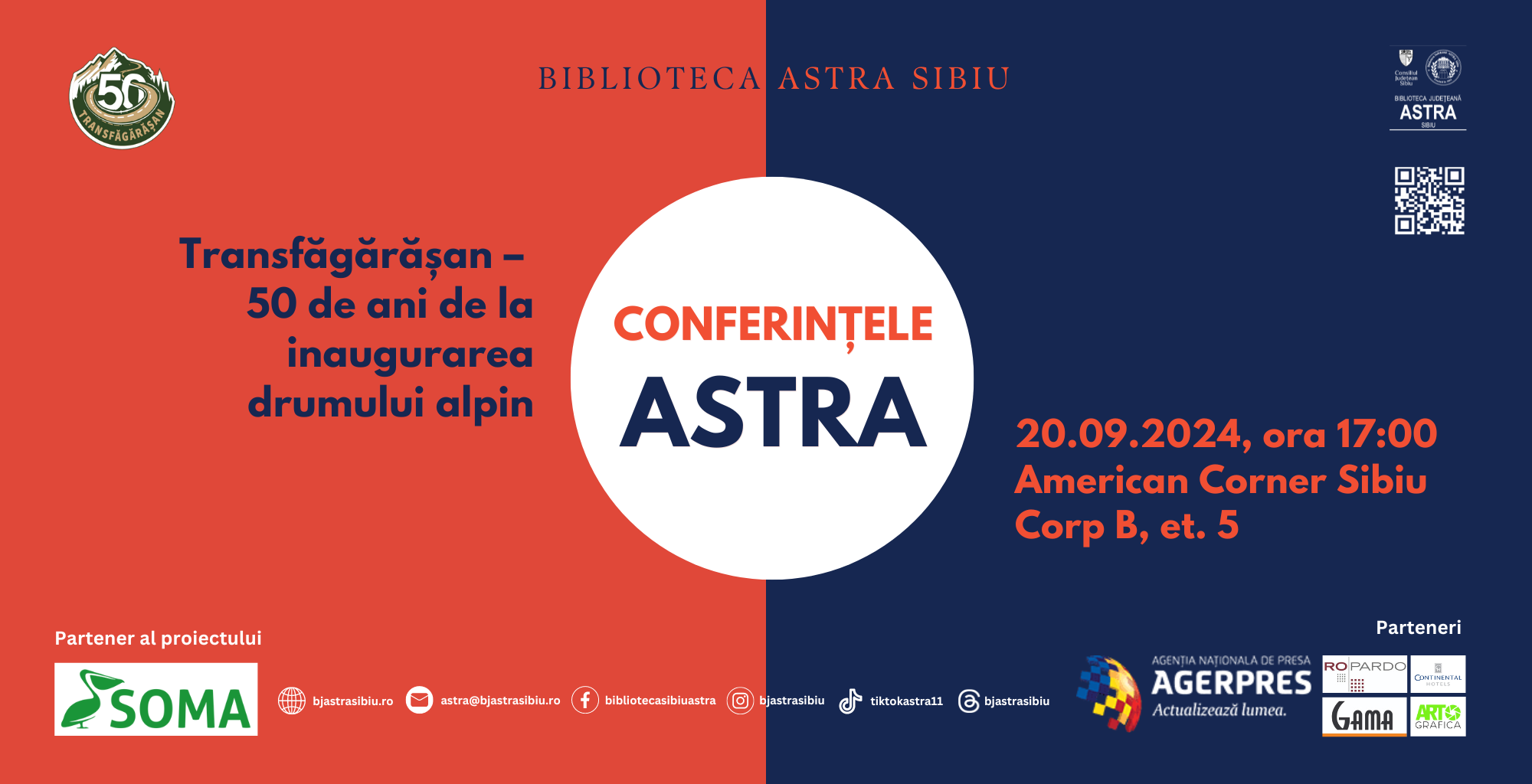 Întâlnirea cu tema „Transfăgărășan – 50 de ani de la inaugurare” va fi dedicată unuia dintre cele mai impresionante proiecte inginerești din România. Cu ocazia acestei aniversări semnificative, vor fi aduse în discuție importanța și impactul istoric, cultural și turistic al spectaculosului drum alpin dintre Muntenia și Transilvania. Printre subiectele propuse în discuție se numără: istoria construcției Transfăgărășanului, impactul economic și turistic al acestuia asupra regiunii și a țării, provocările ecologice și de conservare a patrimoniului natural în zonă și alte aspecte ale acestui proiect de infrastructură emblematic. Invitați în cadrul evenimentului vor fi: asist.univ.dr. Daniela Stanciu-Păscărița, lect.univ.dr. Mihai Rusu, dr. Valer Cosma, managerul Bibliotecii Universității „Lucian Blaga” Sibiu. Întâlnirea va fi moderată de dr. Răzvan C. Pop, managerul Bibliotecii ASTRA Sibiu, și se va încheia cu o sesiune de întrebări și răspunsuri, oferind ocazia participanților de a-și exprima opiniile privind viitorul Transfăgărășanului.