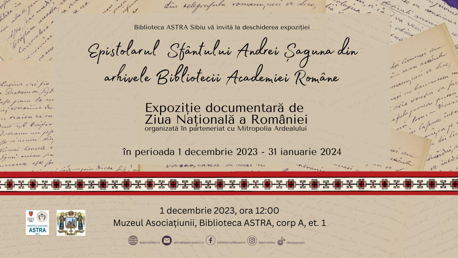 Biblioteca Județeană ASTRA Sibiu sărbătorește Ziua Națională a României prin vernisarea expoziției documentare „Epistolarul Sfântului Andrei Șaguna din arhivele Bibliotecii Academiei Române”, organizată în parteneriat cu Mitropolia Ardealului. Evenimentul va avea loc în data de 1 Decembrie 2023, la ora 12:00, în spațiul Muzeului Asociațiunii, din cadrul bibliotecii publice, instituție care se bucură de susținerea financiară a Consiliului Județean Sibiu.