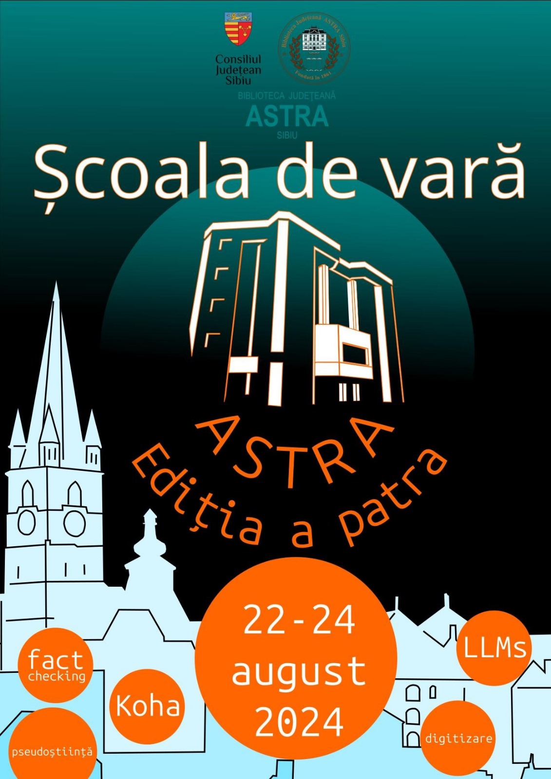 Școala de Vară ASTRA, a patra ediție, se va desfășura în perioada 22-24 august 2024, la Biblioteca Județeană ASTRA Sibiu, instituție care beneficiază de susținere financiară din partea Consiliului Județean Sibiu. Dedicat profesioniștilor din domeniul științelor informării și documentării, în special, bibliotecarilor, evenimentul va oferi participanților prilejul de a urmări prezentări și aplicații practice referitoare la: utilizarea de sisteme integrate open-source care permit gestionarea activităților și documentelor dintr-o bibliotecă, dezvoltarea competențelor de verificare a faptelor prin problematizare și exerciții, evidențierea diferențelor între științe și pseudoștiințe și modul în care bibliotecile pot contribui la educația științifică, prelucrarea datelor și valorificarea resurselor culturale digitale.