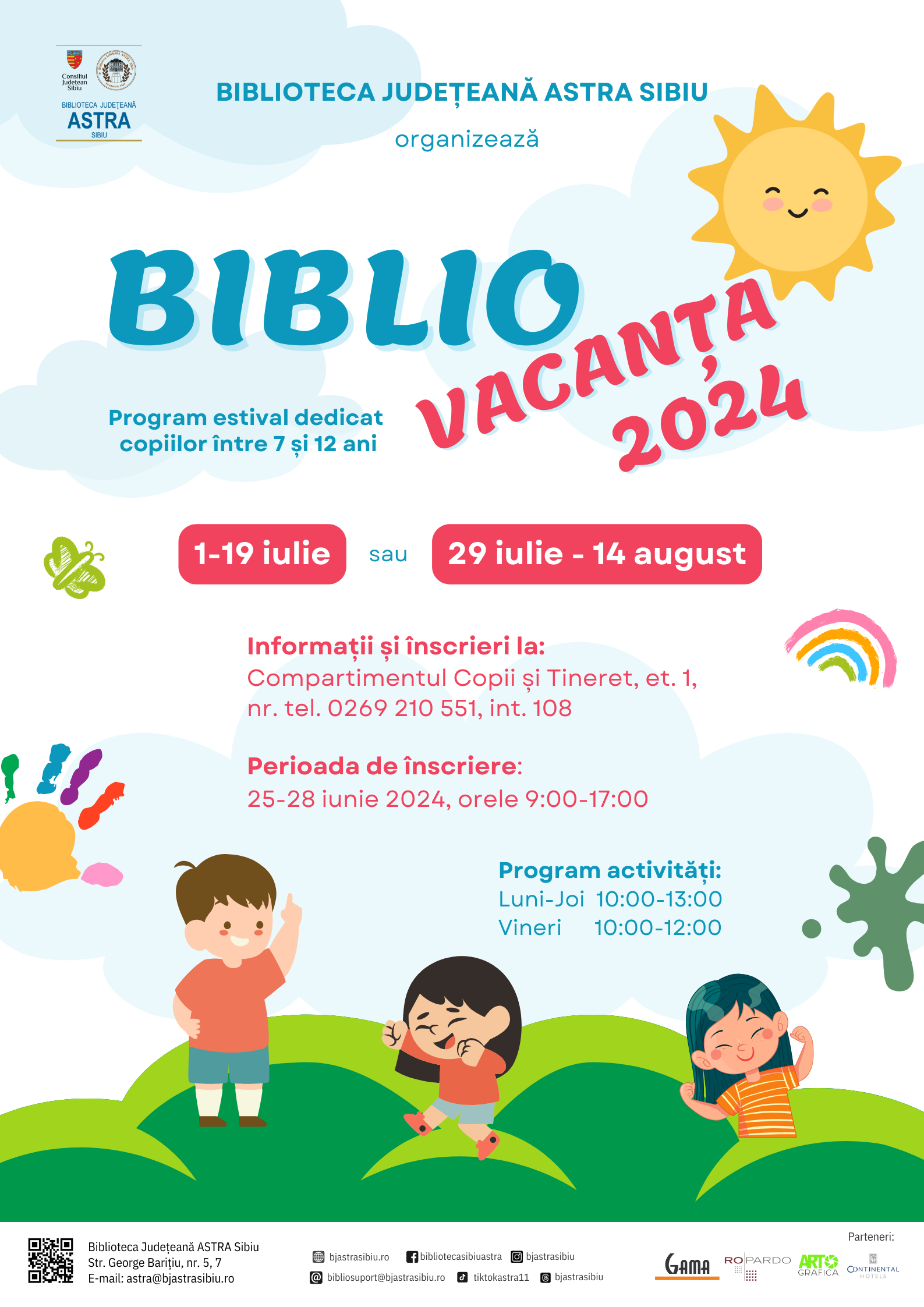 Informații despre programul „Bibliovacanța” se pot obține la Compartimentul pentru Copii și Tineret (Str. George Barițiu, nr. 7, corp B, et.1) și la tel. 0269 210 551, int. 108.