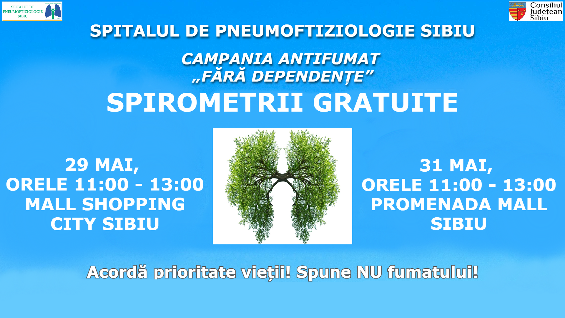Săptămâna viitoare, în zilele de 29 și 31 mai, echipa medicală a Spitalului de Pneumoftiziologie Sibiu efectuează gratuit spirometrii pentru cetățenii care doresc să își evalueze gradul de sănătate a plămânilor.