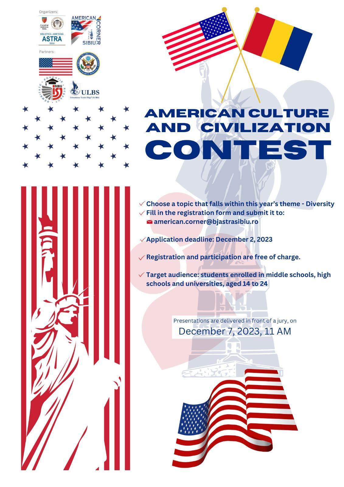 Biblioteca Județeană ASTRA Sibiu și American Corner Sibiu organizează Concursul de Cultură și Civilizație Americană/ American Culture and Civilization Contest, în parteneriat cu Ambasada S.U.A. în România, Universitatea „Lucian Blaga” din Sibiu (ULBS) și Inspectoratul Școlar Județean Sibiu, cu sprijinul Consiliului Județean Sibiu.