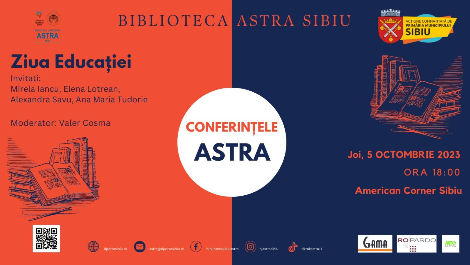 Ziua Educației va fi marcată pe 5 octombrie, la Biblioteca ASTRA, printr-o nouă întâlnire, în cadrul proiectului „Conferințele ASTRA”, cofinanțat de Primăria Municipiului Sibiu și susținut de Consiliul Județean Sibiu.