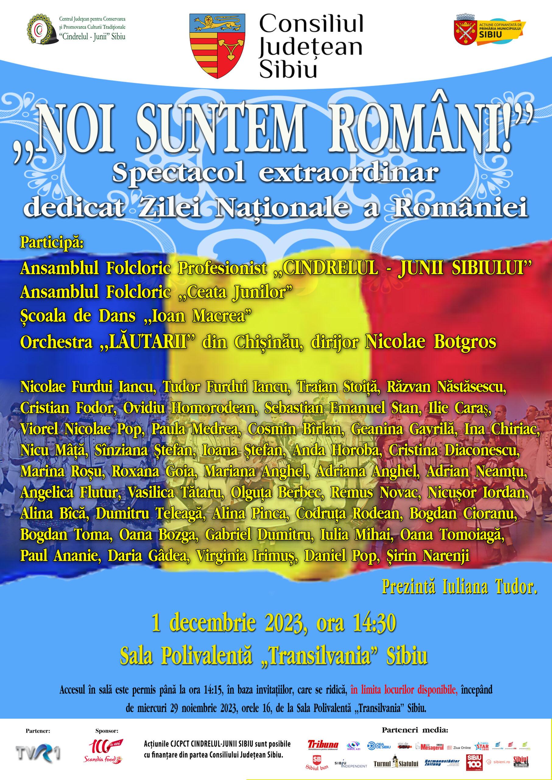 De Ziua Națională a țării, din centrul României, de la Sibiu, pornește un mesaj de iubire și prețuire pentru românii de ieri, care au contribuit la înfăptuirea Unirii, pentru românii de azi care vorbesc lumii întregi despre România frumoasă și pentru românii de mâine, copiii care primesc moștenirea culturală și istorică a acestui pământ. Astfel, spectacolul extraordinar „Noi suntem români!”, organizat la Sala „Transilvania” din Sibiu, în data de 1 decembrie 2023, ora 14.30 va reuni deopotrivă cântece patriotice, cântece şi dansuri populare româneşti.