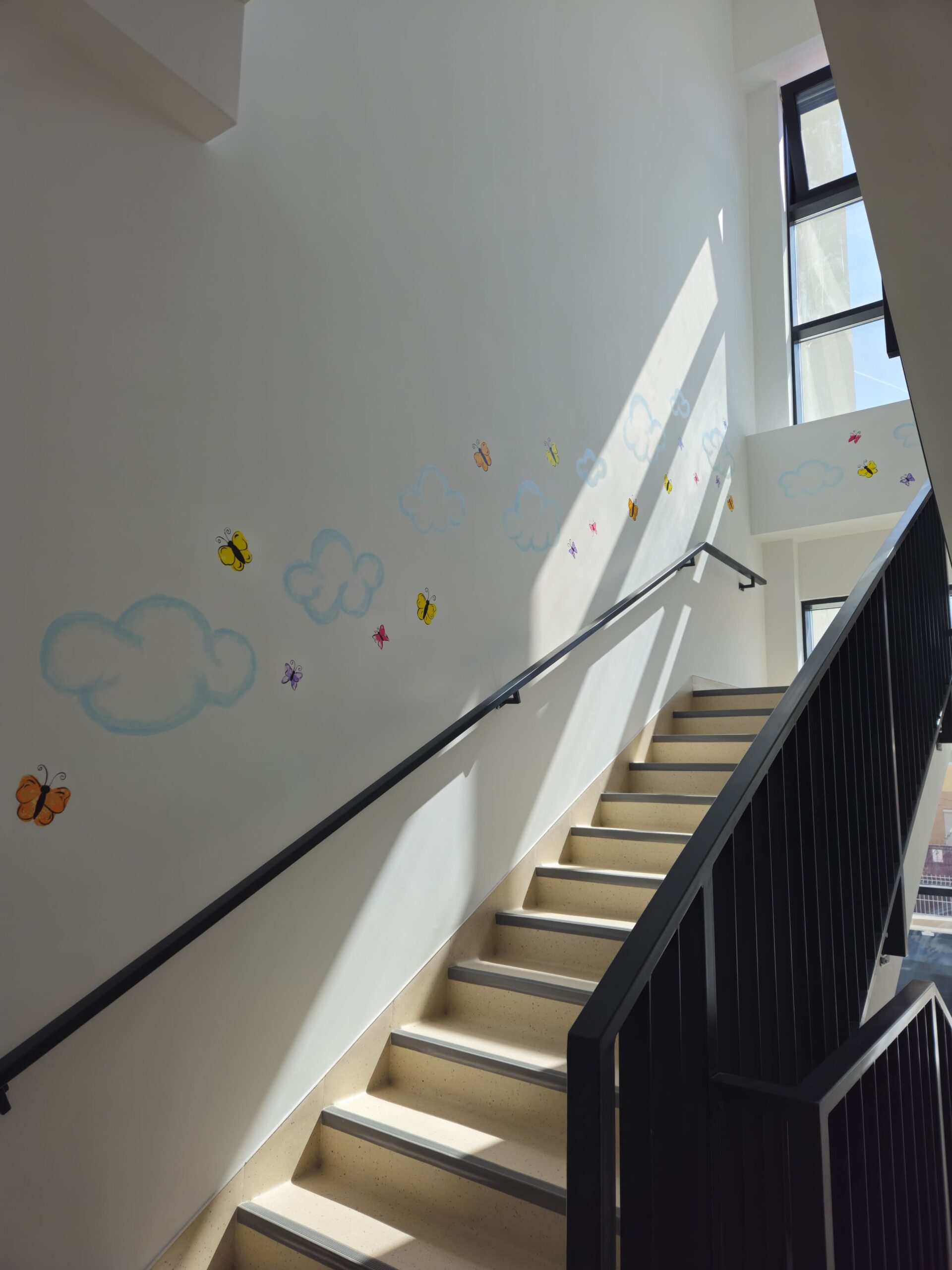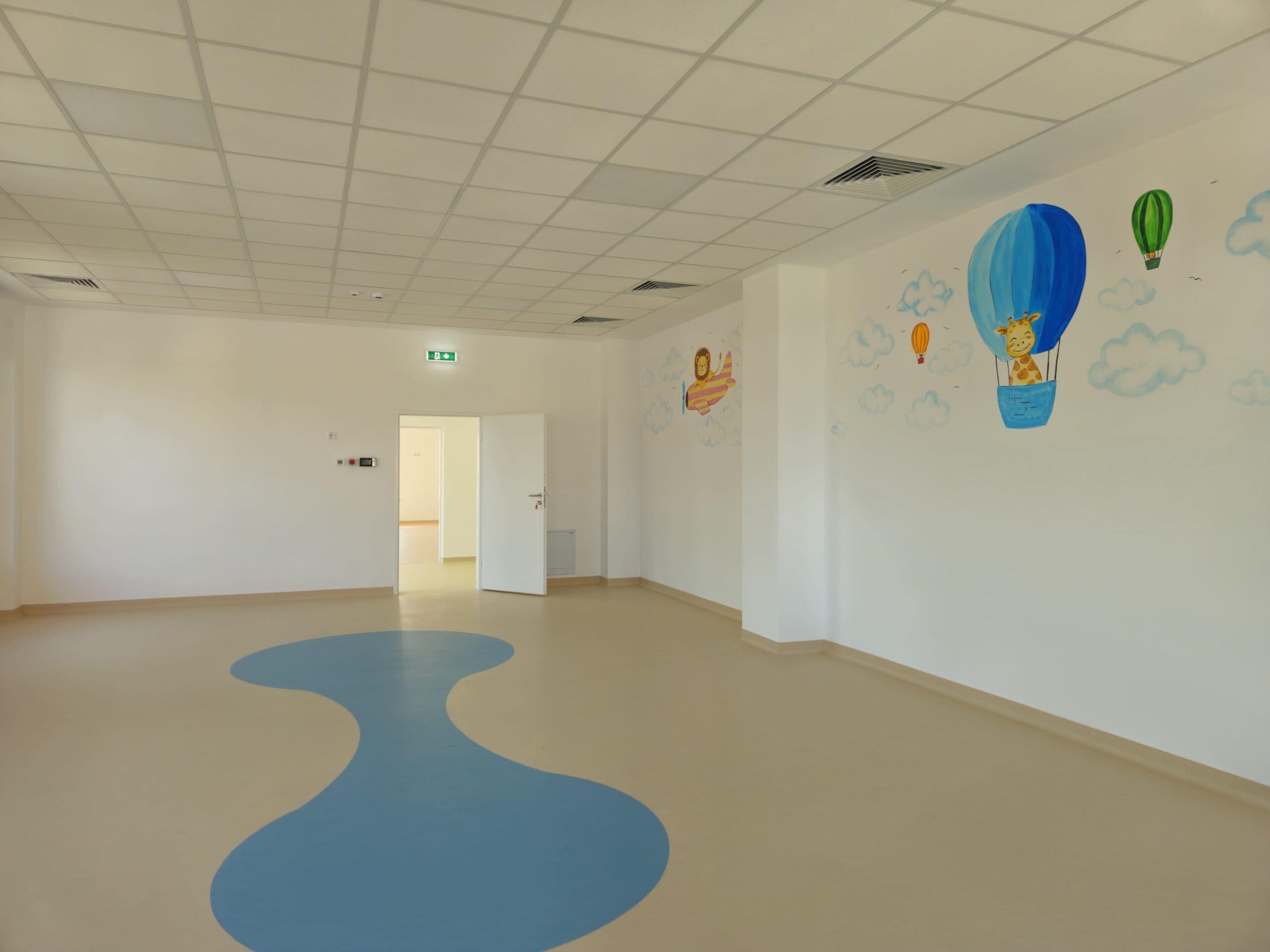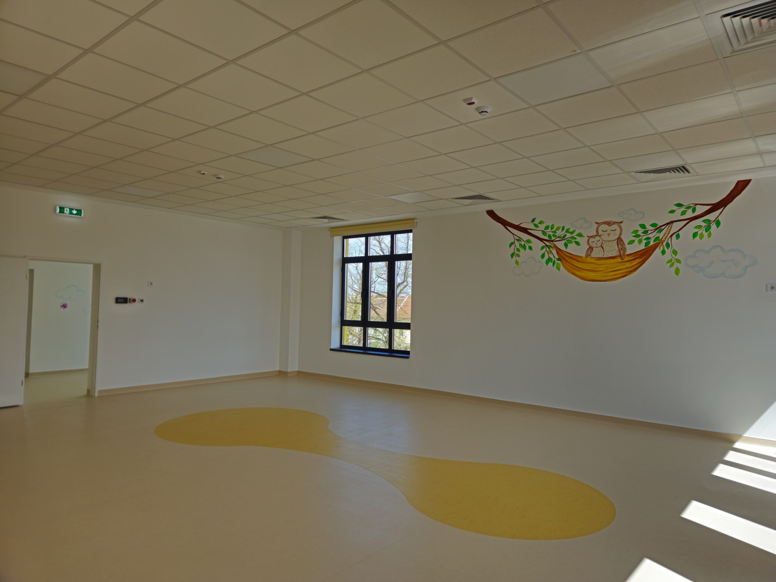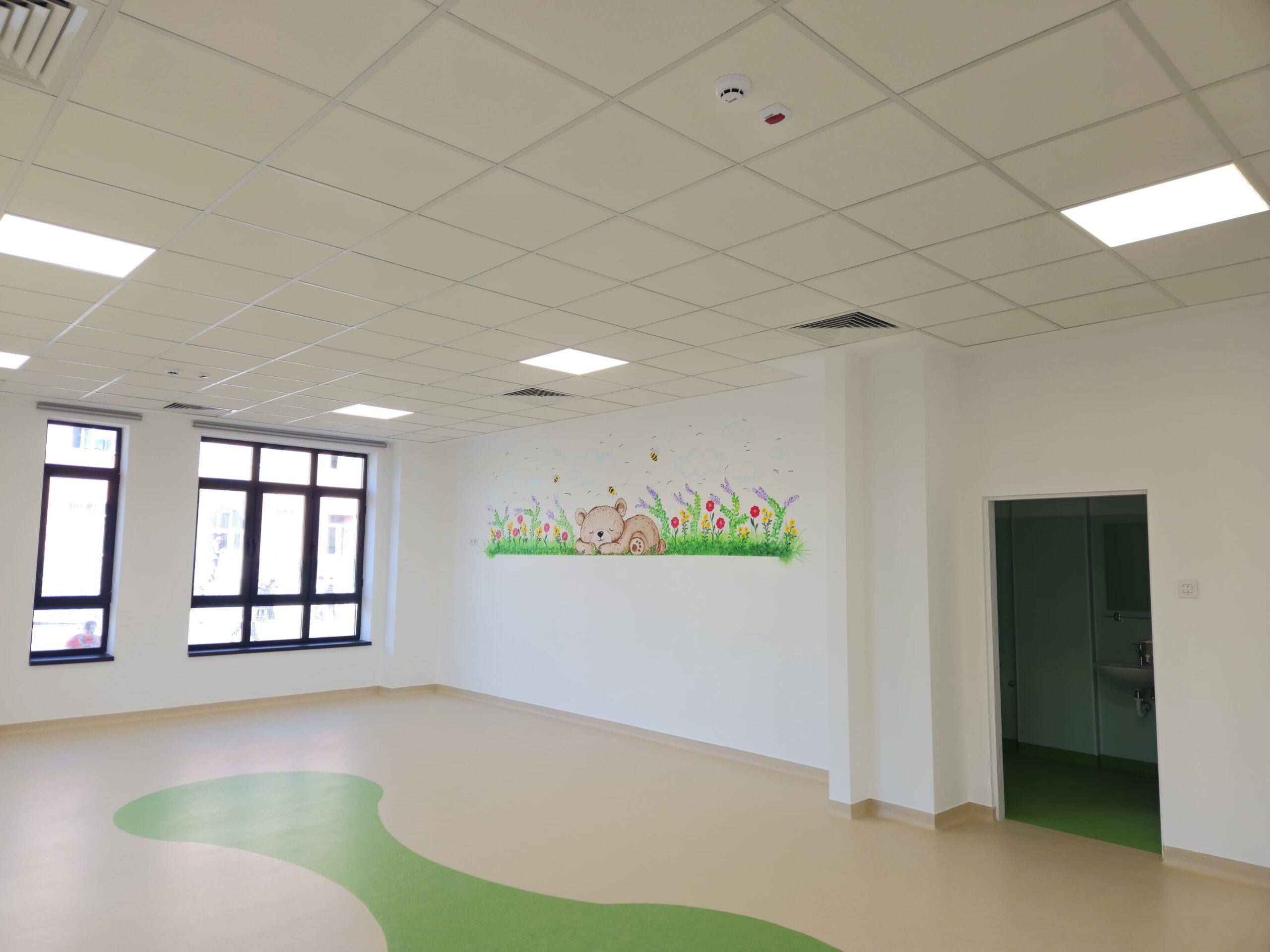 – etajul este destinat grădiniței și dispune de: 3 săli de clasă, grupuri sanitare și vestiare și o zonă multifuncțională cu oficiu pentru servirea mesei.