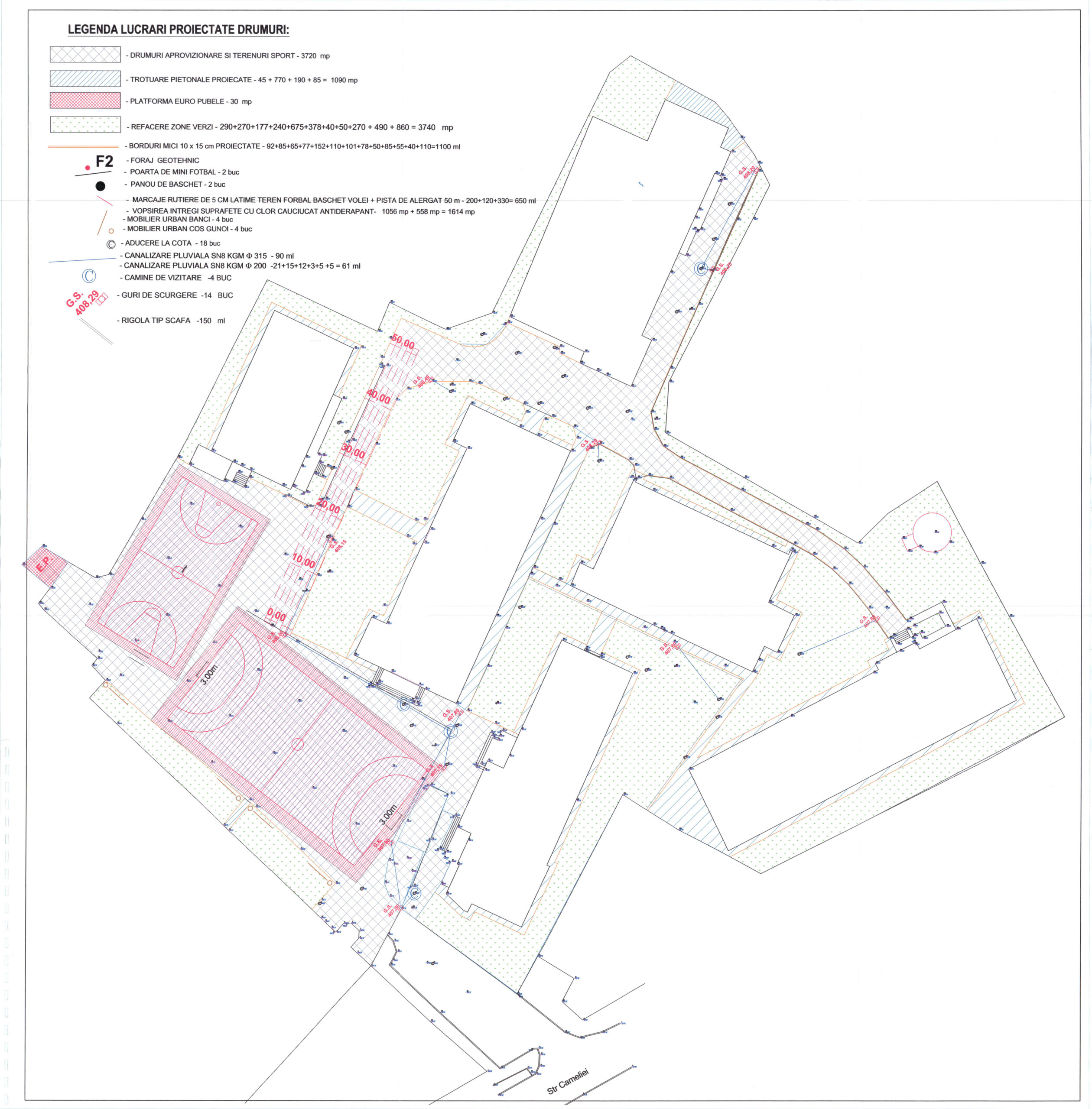 - Se vor amenaja două terenuri de sport: unul de minifotbal (1056 mp) și unul de baschet (558 mp), a căror suprafață va fi vopsită cu o substanță specială, cauciucată; acestea vor dotate cu porți de fotbal și respectiv panouri de baschet