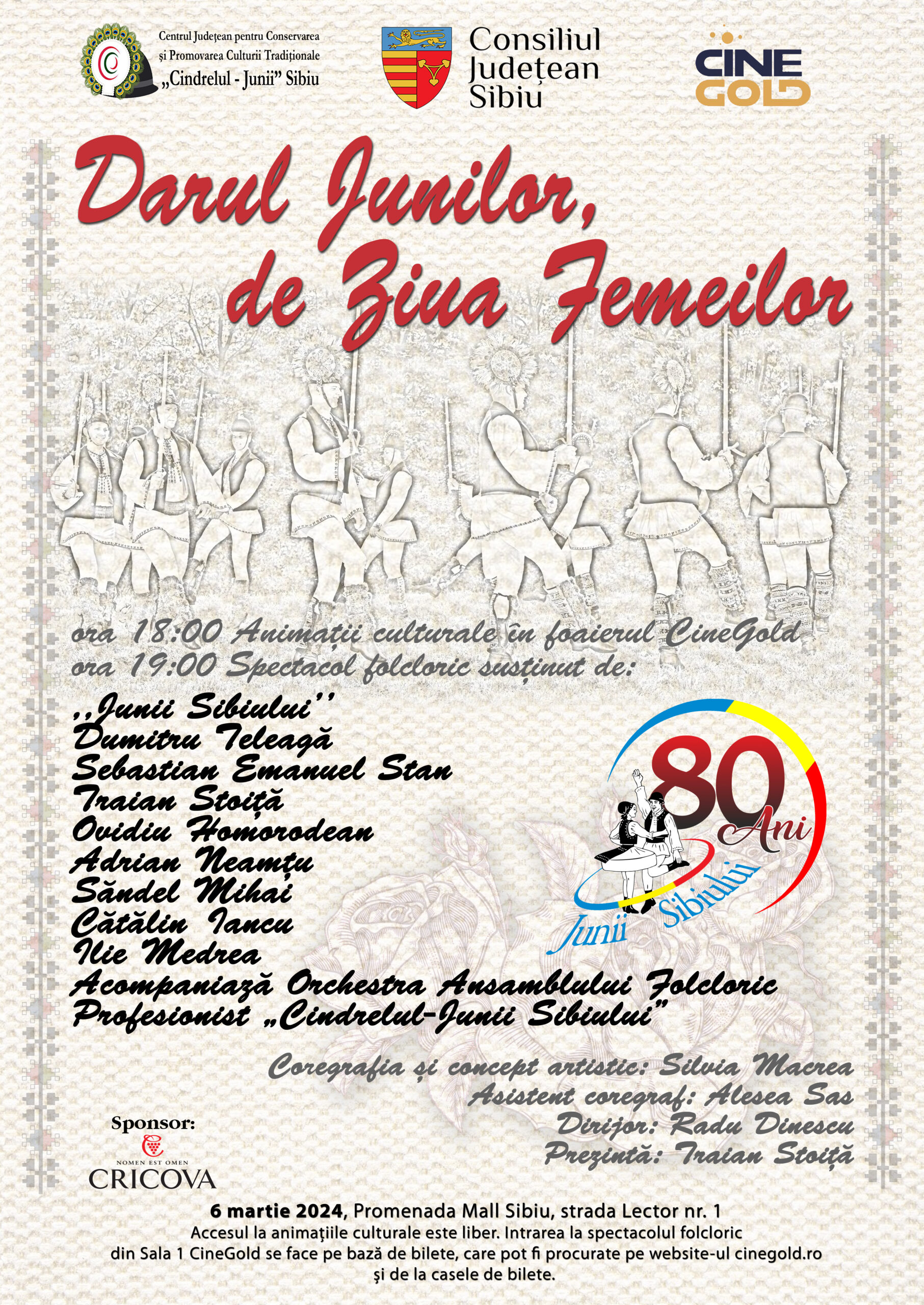 Cu gândul la toate femeile ce sunt oficial sărbătorite cu ocazia zilei de 8 martie, Centrul Judeţean pentru Conservarea şi Promovarea Culturii Tradiţionale „Cindrelul-Junii” Sibiu, din subordinea Consiliului Județean Sibiu, invită doamnele și domnișoarele să se bucure de multe surprize, alături de Junii Sibiului, sub genericul „Darul Junilor, de Ziua Femeilor”. Evenimentul are loc miercuri, 6 martie 2024, între orele 18.00 și 21.00, la CineGold, în incinta Promenada Mall Sibiu.