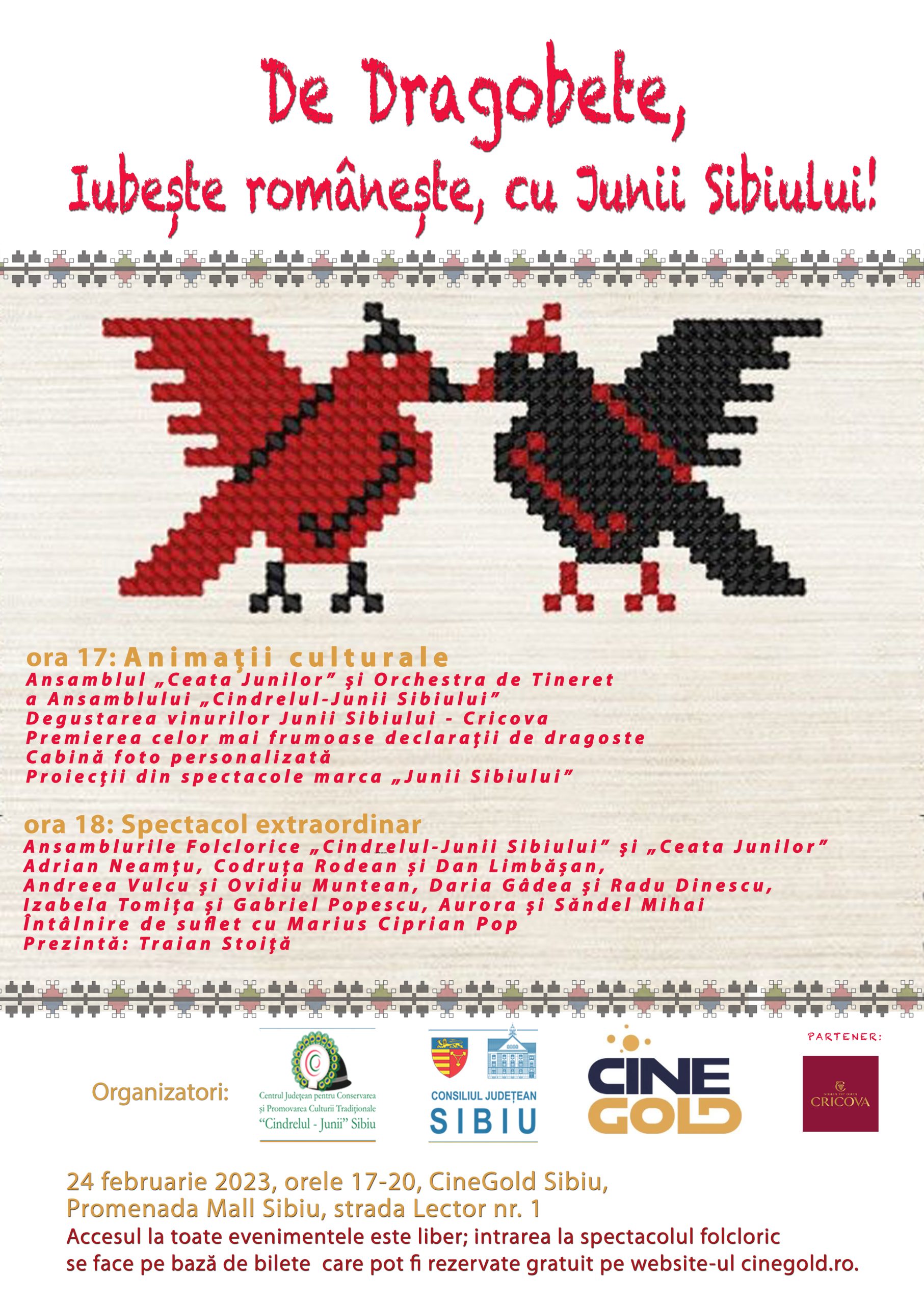 Provocăm tinerii îndrăgostiţi şi îndrăgostiţii cu suflete tinere să celebreze iubirea, în mod tradițional, dar cu multe surprize, alături de Junii Sibiului. Astfel, vineri 24 februarie 2023, orele 17-20, vom spune împreună: „De Dragobete, Iubește Românește, cu Junii Sibiului!”, în cadrul unui eveniment complex care va fi găzduit de un spațiu inedit – CineGold din incinta Promenada Mall Sibiu (str. Lector nr. 1-3). Manifestarea este organizată de CJCPCT „Cindrelul-Junii” Sibiu, din subordinea Consiliului Județean Sibiu, și CineGold Sibiu.