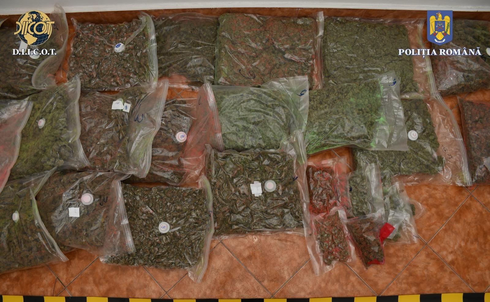 Au fost descoperite și ridicate 40 de kilograme de muguri de canabis (ambalate în 48 de pungi vidate), 12 kilograme de hașis, porționat și ambalat (125 de pachete), aproximativ 120 de grame de cristal, precum și o mașină de numărat bani.