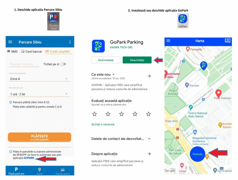 - Taxa pentru parcarea pe Cazarma 90 și în Piața Teatrului se poate plăti de acum și prin aplicația electronică. Din aplicația Parcare Sibiu veți fi direcționați către aplicația Go Park, platformă pe care s-a dezvoltat acest nou instrument de plată. Descărcați gratuit aplicația Go Park și configurați contul (2-3 minute) doar prima dată când folosiți acest instrument. Apoi scanați cu telefonul tichetul cu codul de bare primit la intrarea în parcare și puteți plăti cu cardul/aplicația bancară taxa de 2 lei/oră. La ieșire bariera se va deschide automat, după identificarea numărului de înmatriculare, datorită camerelor speciale pentru citirea acestora, puse în funcțiune în această lună.