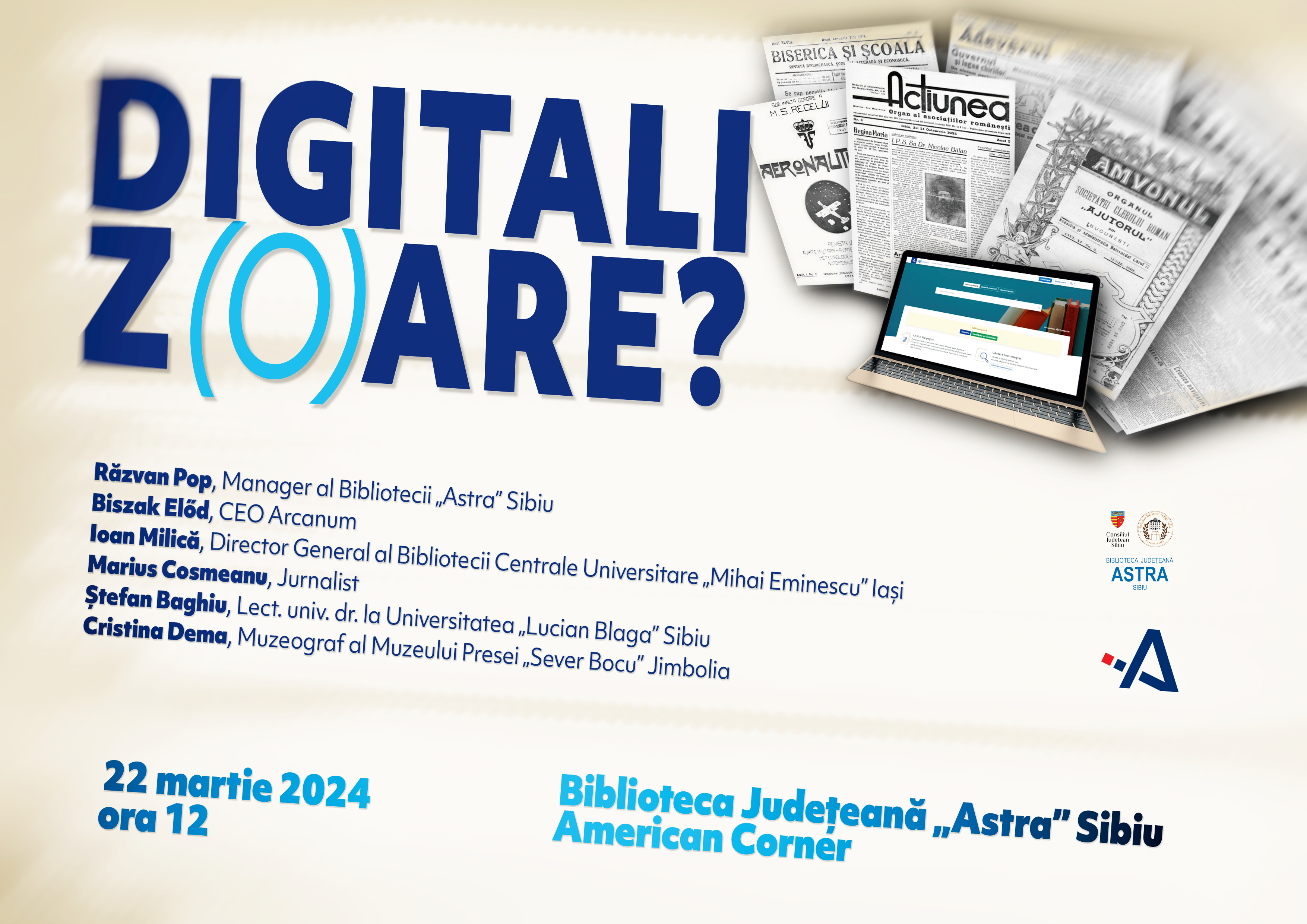 Biblioteca Județeană ASTRA Sibiu și Compania Arcanum organizează vineri, 22 martie 2024, începând cu ora 12:00, evenimentul „Digitalizare/DigitalizOare?” adresat publicului larg și, în special, profesioniștilor din structurile info-documentare. Acțiunea are menirea de a aduce în prim-plan importanța digitalizării atât din perspectiva conservării și punerii în valoare a colecțiilor diferitelor instituții, cât și prin prisma accesibilizării informației. Se va pune în discuție importanța digitalizării în perioada contemporană, iar specialiștii invitați la eveniment vor încerca să lămurească acest aspect.