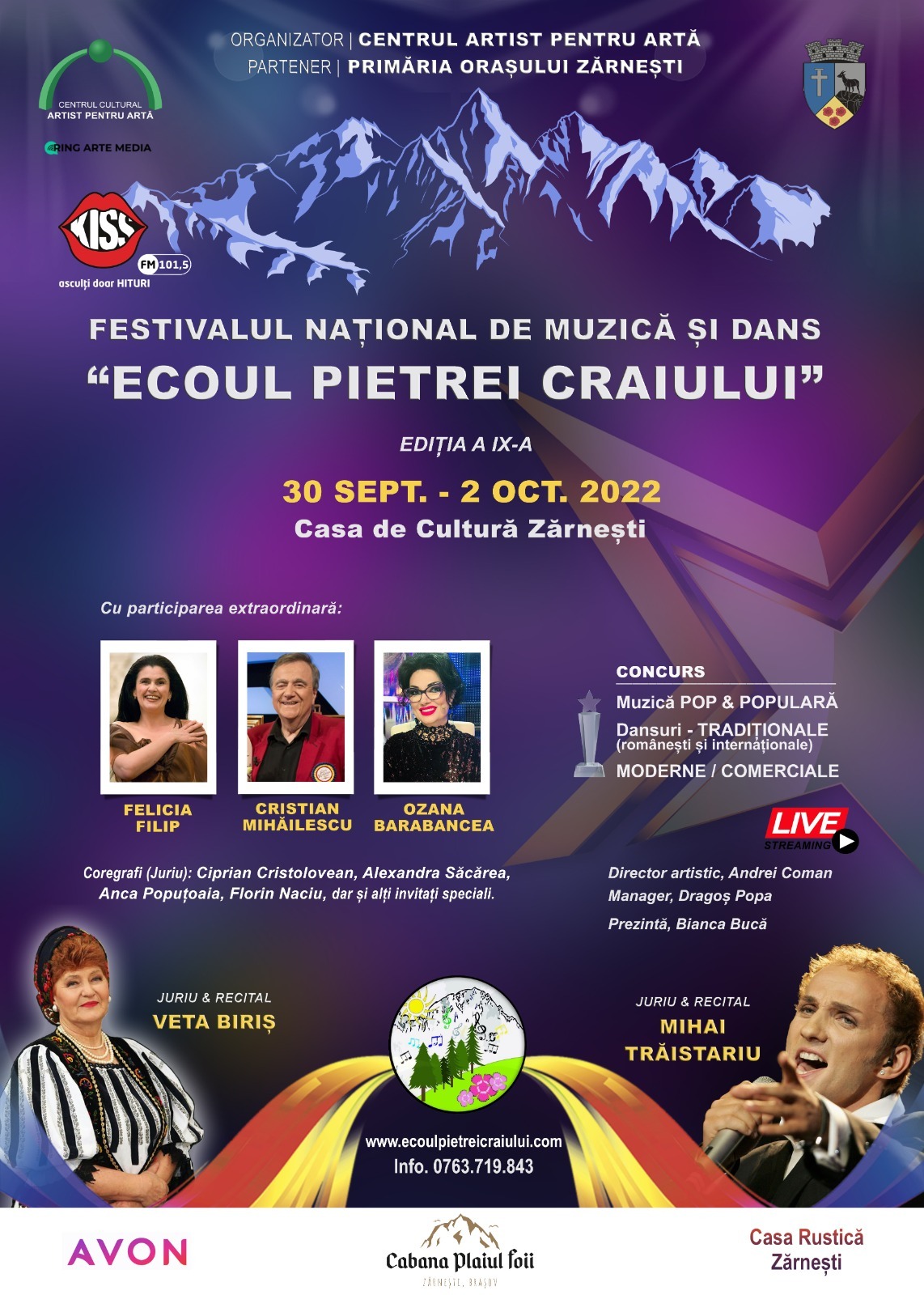 Festivalul Național de Muzică și Dans „Ecoul Pietrei Craiului” aflat la cea de a IX-a ediție, se va desfășura în perioada 30 septembrie – 2 octombrie, la Casa de Cultură a orașului Zărnești. Tineri talentați din toate colțurile țării își vor arăta talentul în cadrul festivalului-concurs, în atenția juriului și a publicului, live și online. Evenimentul este organizat de Centrul Cultural Artist pentru Artă, în parteneriat cu Primăria Orașului Zărnești, fiind inclus pe lista evenimentelor culturale care beneficiază de finanțare nerambursabilă.