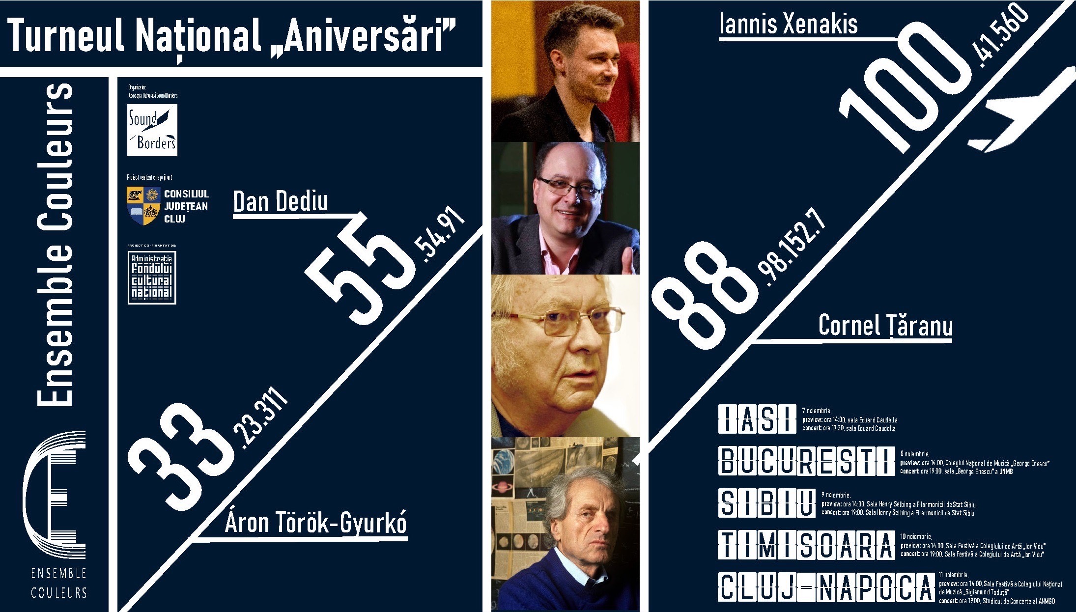Asociația Culturală Sound Borders organizează turneul național ,,Aniversări”. Compozitorii aniversați (menționați în ordine cronologică) sunt: Áron Török-Gyurkó, Dan Dediu, Cornel Țăranu, Iannis Xenakis. Alegerea acestor compozitori este strâns legată de numărul „rotund” al vârstelor pe care cei trei compozitori în viață au atins-o (33, 55, 88), respectiv împlinirea a 100 de ani de la nașterea compozitorului Iannis Xenakis.