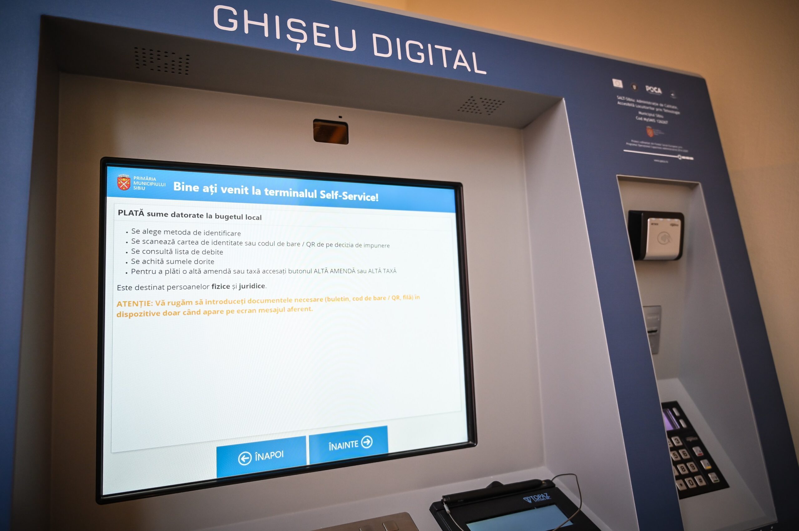 Acest terminal self service a fost creat de Primăria Sibiu în cadrul proiectului “SALT Sibiu – Administrație de calitate, accesibilă locuitorilor prin tehnologie” finanțat din fonduri europene nerambursabile prin Programul Operațional Capacitate Administrativă, Axa prioritară 2 – „Administrație publică și sistem judiciar accesibile și transparente”.