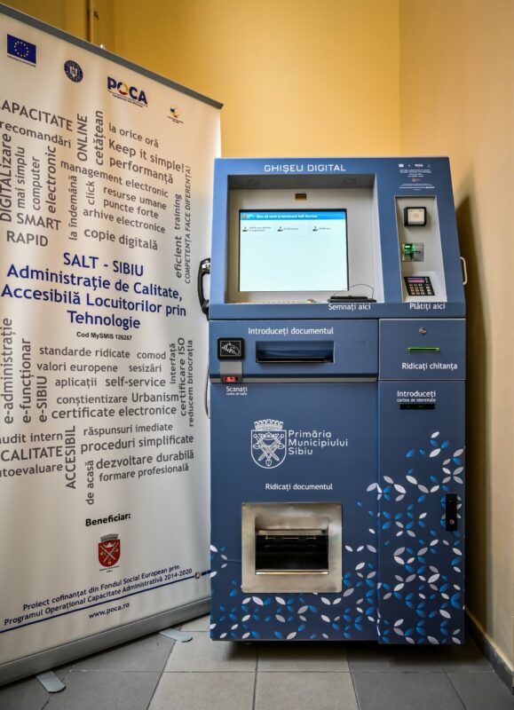 Ghișeu digital al Primăriei Sibiu, în testare. La intrarea pentru cetățeni în sediul principal al Primăriei Sibiu din Piața Mare a fost instalat și pus în funcțiune un aparat care va asigura accesul de serviciile Primăriei fără a fi necesar să stați la coadă pentru a ajunge la ghișeu, în fața unui funcționar. După perioada de testare și încărcarea tuturor funcțiunilor, acest ghișeu va sta la dispoziția sibienilor în program non-stop, până atunci fiind disponibil cetățenilor în orele de program ale instituției.