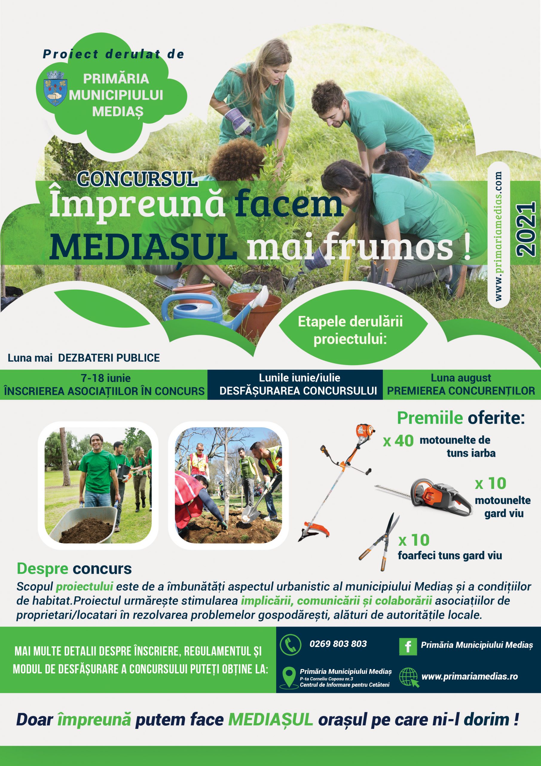 Astfel, împreună cu Direcția de Administrare a Domeniului Public, am pus bazele unui concurs numit: Împreună facem Mediașul mai frumos! Acesta se adresează tuturor asociațiilor de locatari și își propune înfrumusețarea spațiului din fața blocului unde fiecare locuiește.