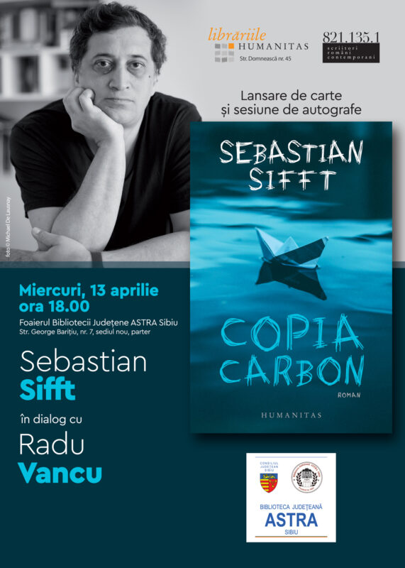 Miercuri, 13 aprilie 2022, la ora 18:00, Biblioteca Județeană ASTRA Sibiu, instituție ale cărei acțiuni sunt posibile cu finanțare din partea Consiliului Județean Sibiu, va găzdui lansarea cărții „Copia Carbon”, al doilea roman al autorului Sebastian Sifft. Evenimentul este organizat de Editura Humanitas și Librăria Humanitas Constantin Noica Sibiu. Cu acest prilej, invitat în dialog cu autorul va fi Radu Vancu, poet, prozator și universitar sibian.