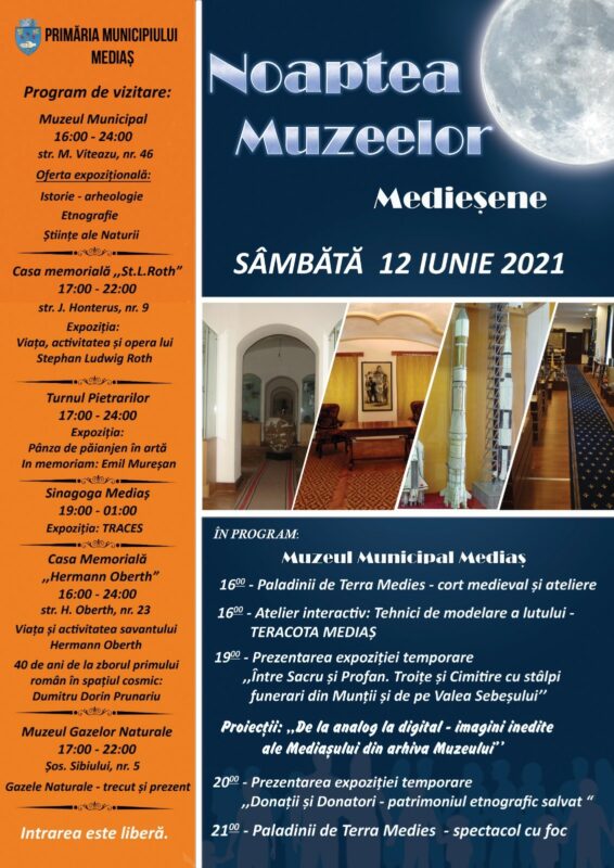 Primăria Municipiului Mediaș, prin Direcția Cultură, Învățământ, Sănătate, Tineret, Sport, Turism, Relații Publice și Relația cu ONG, organizează în data de 12 iunie 2021, un eveniment deosebit care marchează Ziua Internaţională a Muzeelor.