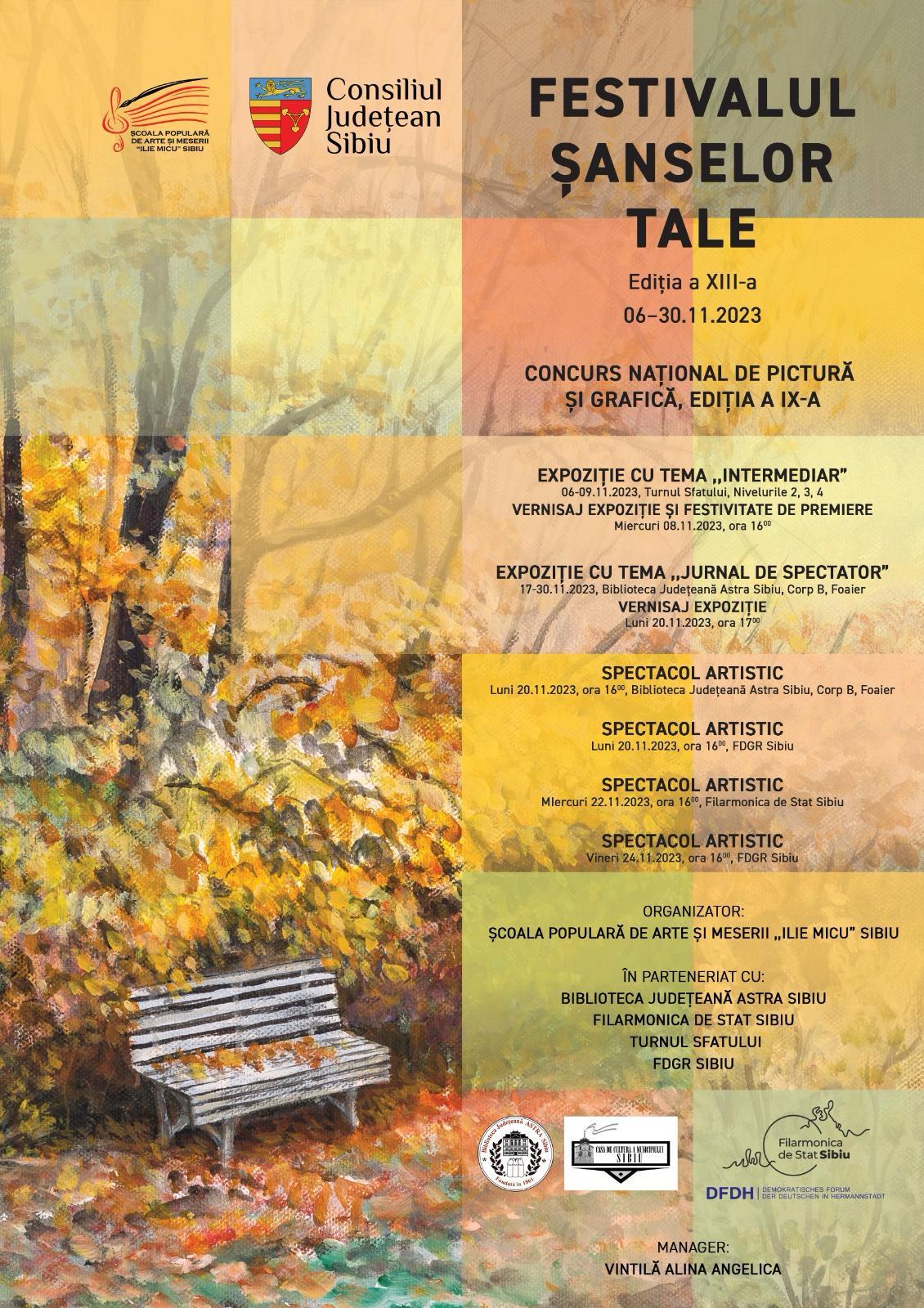 Se continuă șirul evenimentelor din cadrul Festivalului Șanselor Tale ediția a XIII-a și vă așteaptă să fiți alături și în această săptămână la următoarele evenimente, unde vor participa cei mai talentați elevi ai Școlii Populare de Arte. Precizăm că în acest an s-au împlinit 70 de ani de la înființare, astfel toate evenimentele organizate pe parcursul acestui an au fost dedicate acestei aniversări.
