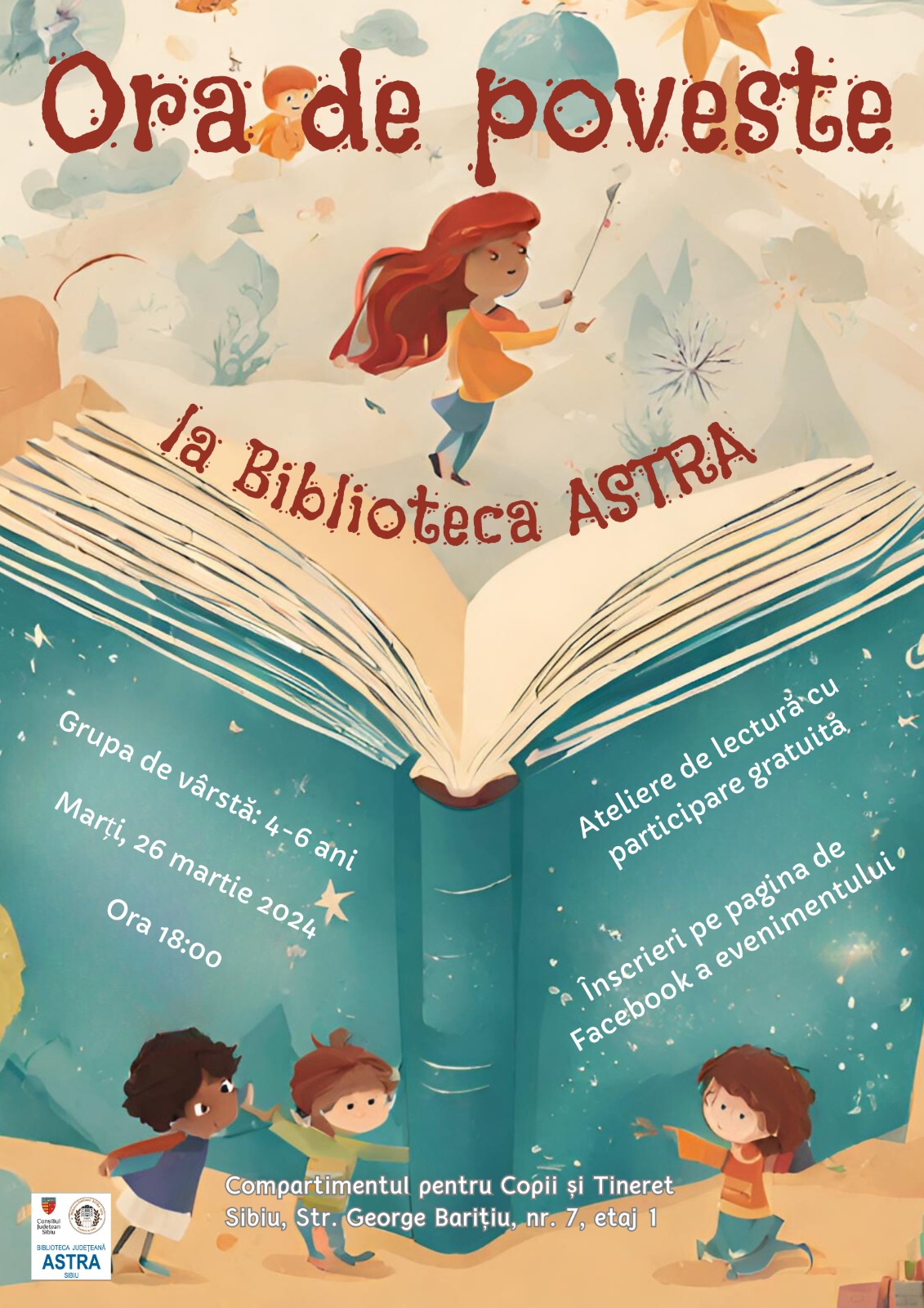 Biblioteca ASTRA Sibiu lansează, la sfârșitul lunii martie a.c., proiectul de lectură „Ora de poveste” dedicat copiilor cu vârste cuprinse între 4 și 12 ani. Lunar, cei mici, vor putea participa la ateliere de activități structurate pe grupe de vârstă, desfășurate la Compartimentul pentru Copii și Tineret, unde vor asculta povești, vor citi și vor discuta despre textele prezentate.