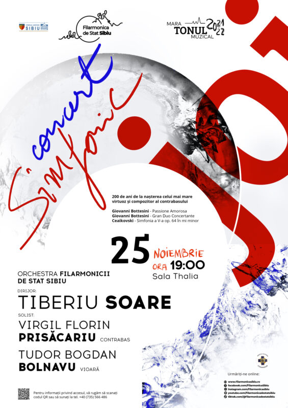 Împreună cu orchestra Filarmonicii de Stat Sibiu, sub bagheta dirijorului principal Tiberiu Soare, pe scena Sălii Thalia se vor afla soliștii Virgil Florin Prisacariu – contrabas și Tudor Bogdan Bolnavu – vioară.