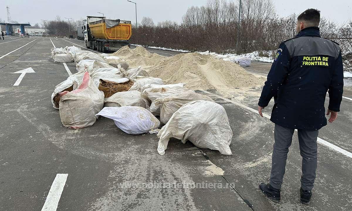 Poliţiștii de frontieră din cadrul Punctului de Trecere a Frontierei Călăraşi au descoperit, 57 de saci încărcați cu frunze de tutun, ascunși în semiremorca unui ansamblu rutier printre încărcătura de nisip.