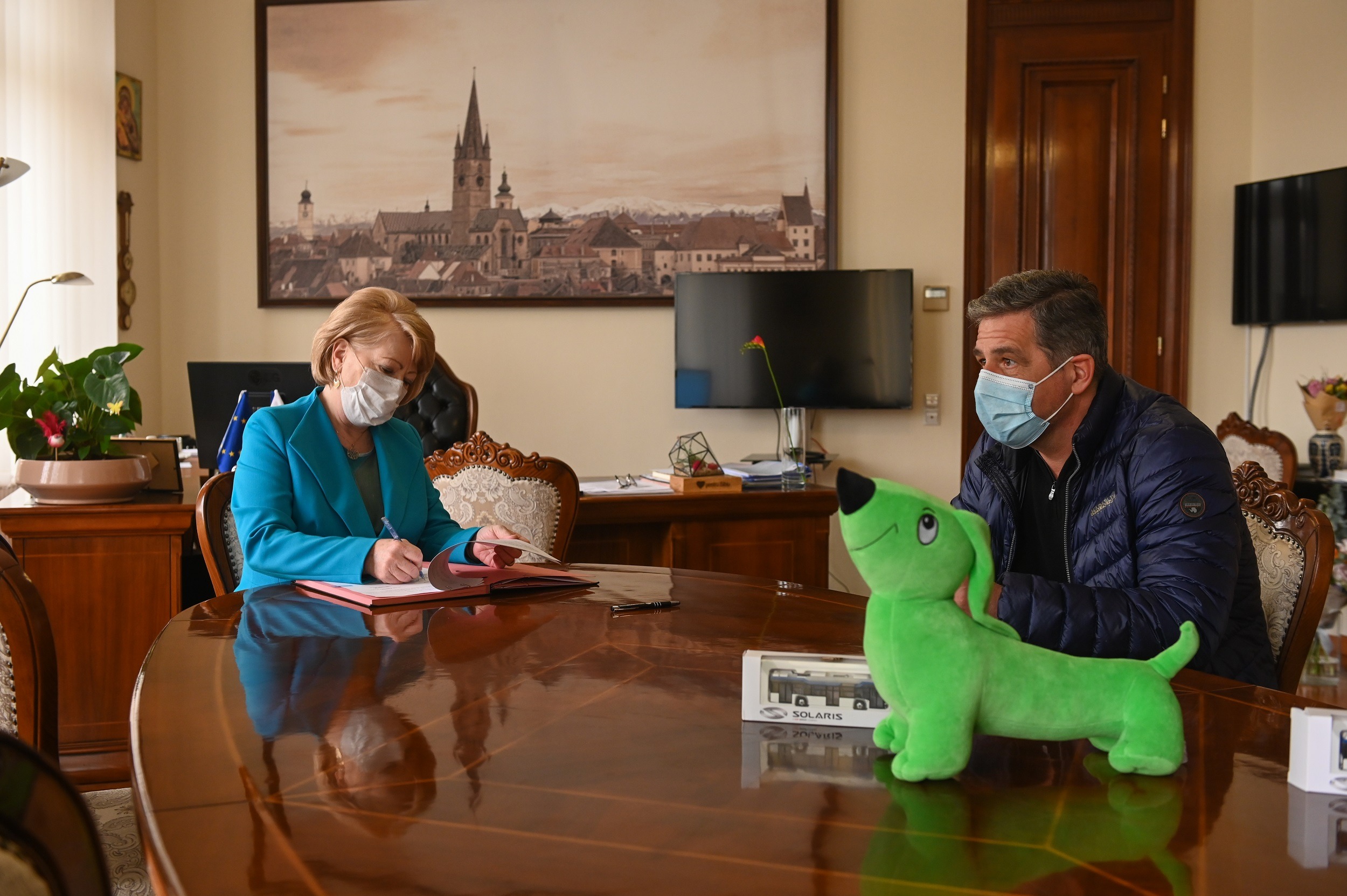 “Achiziția a 9 autobuze electrice care vor deservi traseele 5 și 13 s-a concretizat astăzi prin semnarea contractului, ca urmare a unui proiect pe care Primăria Sibiu îl desfășoară în parteneriat cu Ministerul Dezvoltării, Lucrărilor Publice și Administrației. Managerul general al firmei Solaris Bus & Coach România, domnul Eugen Daniel Ciolan, m-a asigurat că vor livra autobuzele cât mai repede posibil, înainte de termenul contractual. Reamintesc că am semnat deja contractul pentru microbuzele electrice care vor circula pe Linia Verde de transport local din centrul istoric, iar procedura de achiziție pentru cele 40 de autobuze se apropie de finalizare, raportul procedurii fiind întocmit și trimis la Autoritatea Națională pentru Achiziții Publice pentru avizare. Prin urmare, construim un sistem de transport public mai atractiv pentru sibieni, încurajând astfel, concret, mobilitatea alternativă” (Astrid Fodor, primarul municipiului Sibiu)