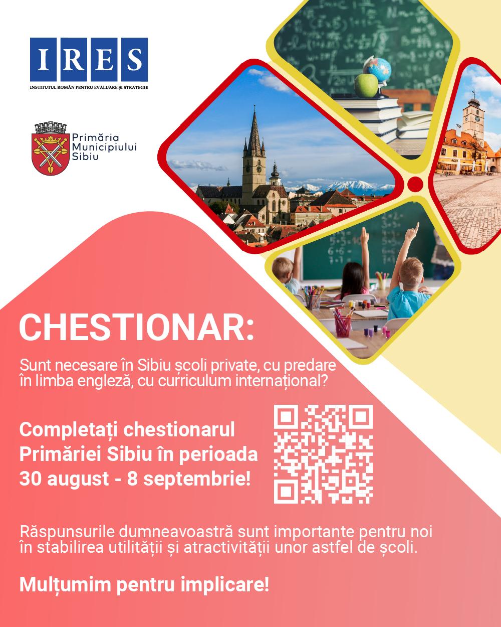 Primăria Municipiului Sibiu, prin intermediul specialiștilor Institutului Român pentru Evaluare și Strategie (IRES), derulează în perioada 30 august – 8 septembrie un sondaj de opinie la nivelul Municipiului Sibiu cu privire la oportunitatea înființării de școli private cu predare în limba engleză, cu un curriculum internațional, de către entități dispuse să investească.